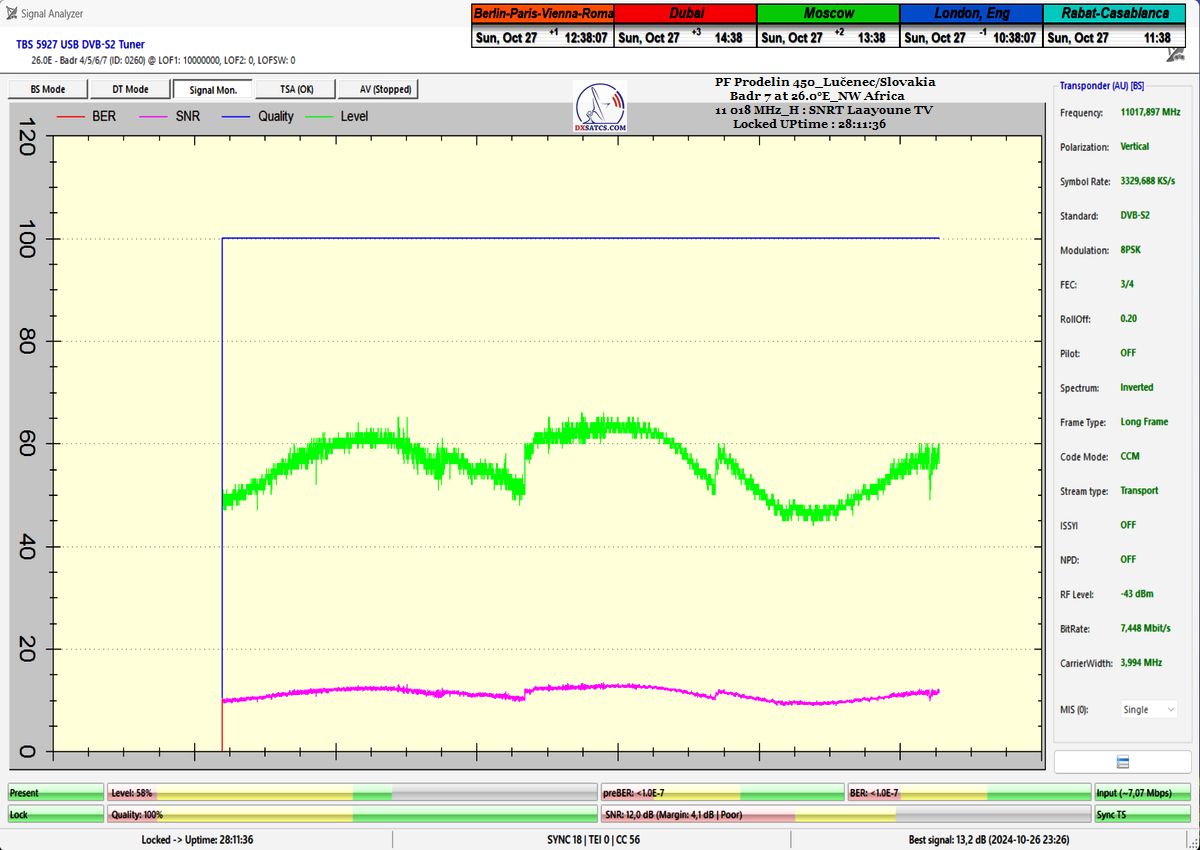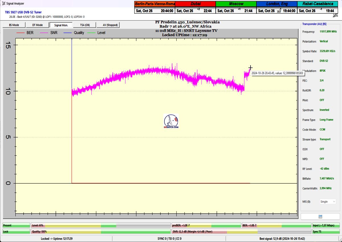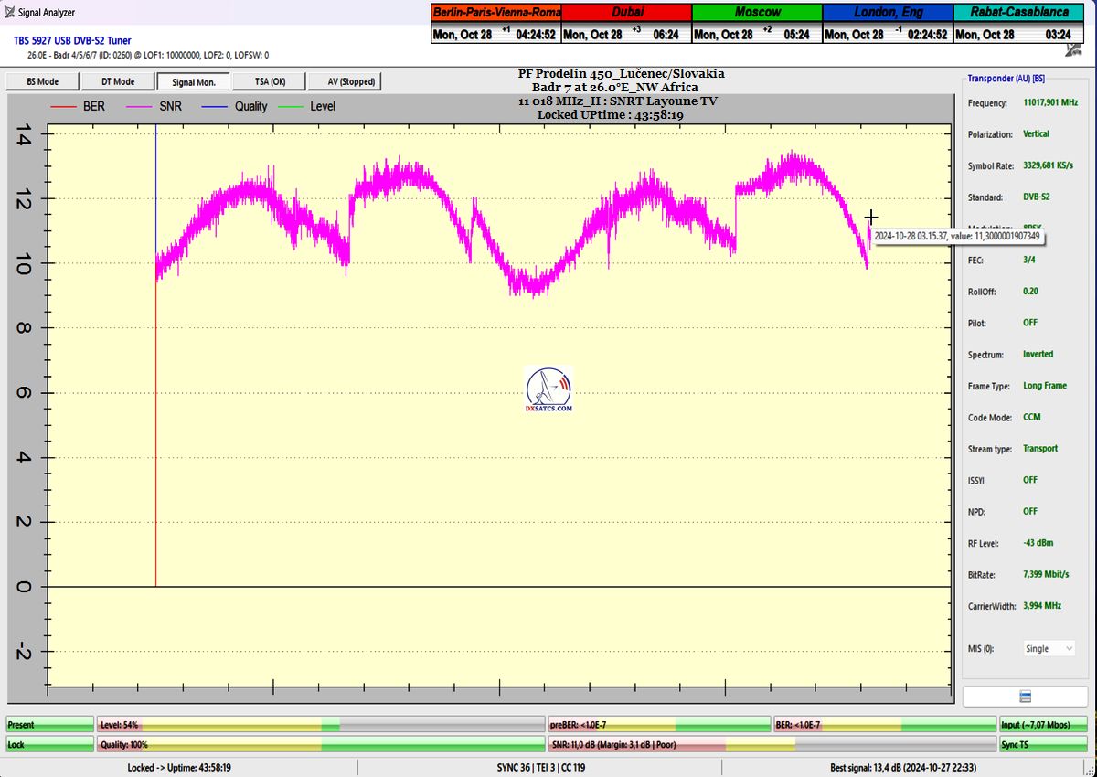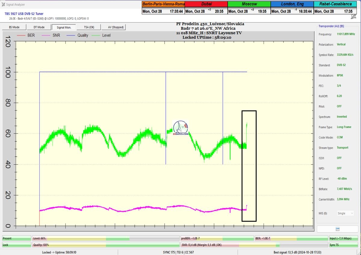 ►►Badr 7 at 26.0°E-Northwest Africa : Continuous signal monitoring / Nepretržitý signálny monitoring
