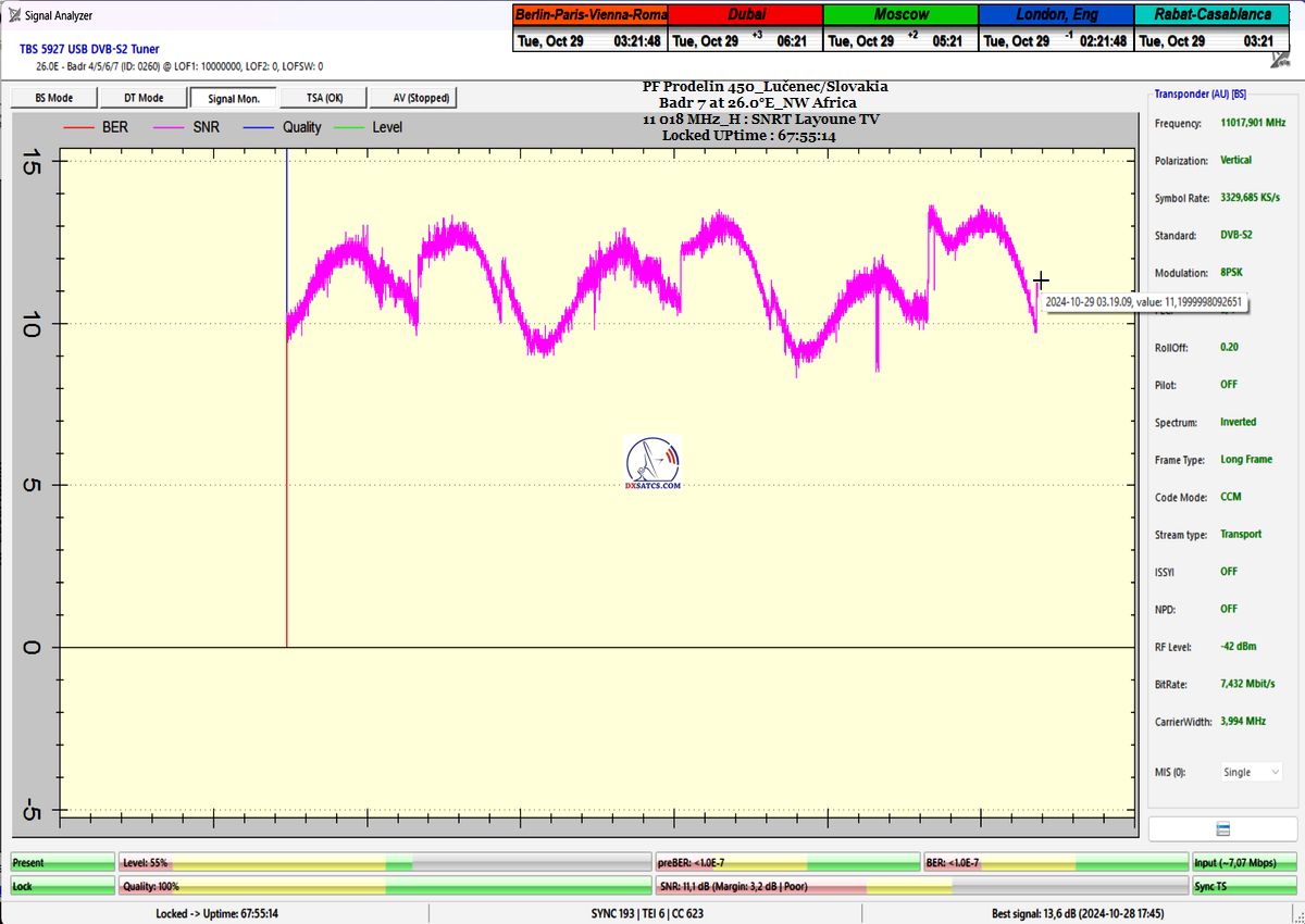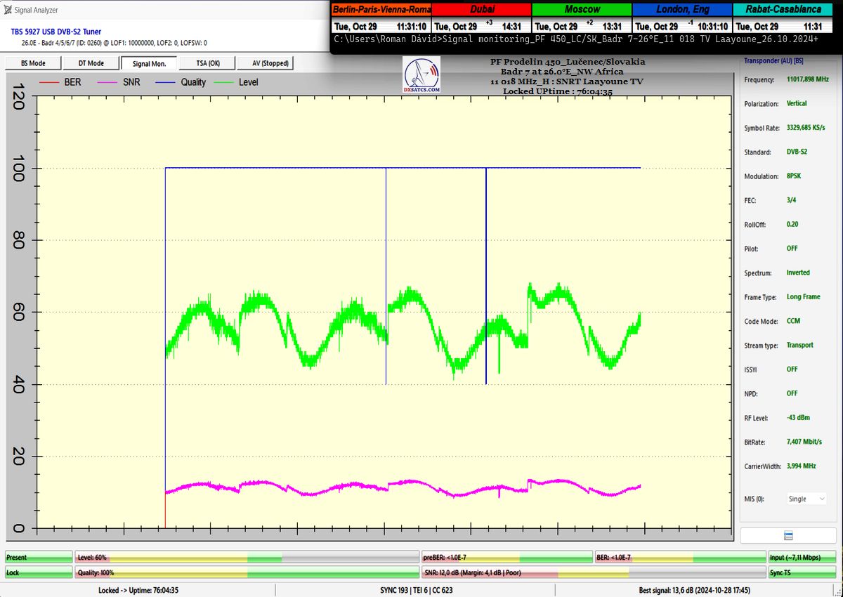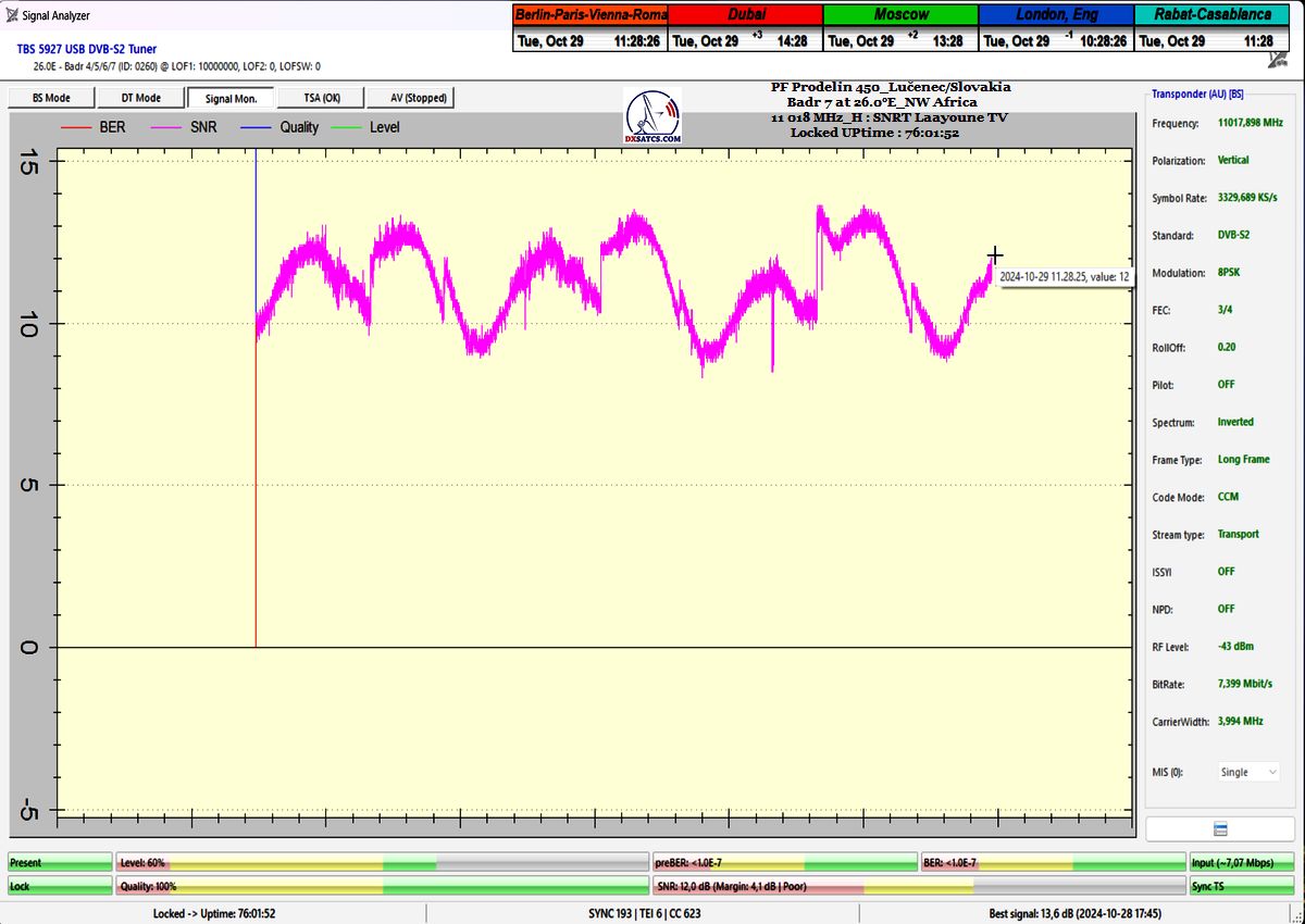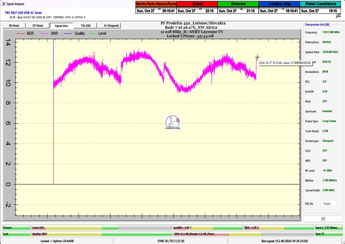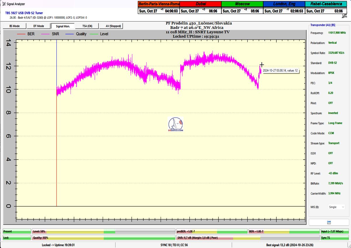 ►►Badr 7 at 26.0°E-Northwest Africa : Continuous signal monitoring / Nepretržitý signálny monitoring
