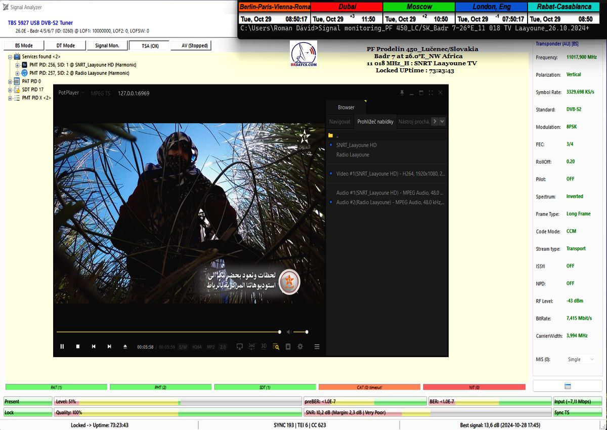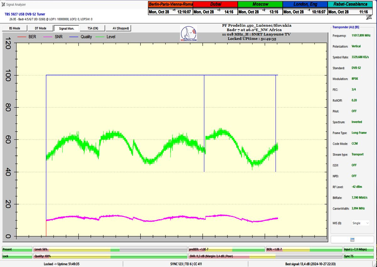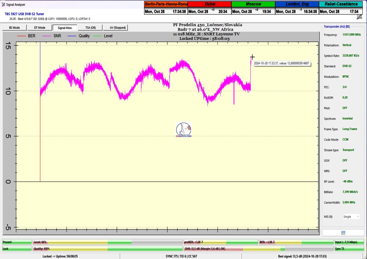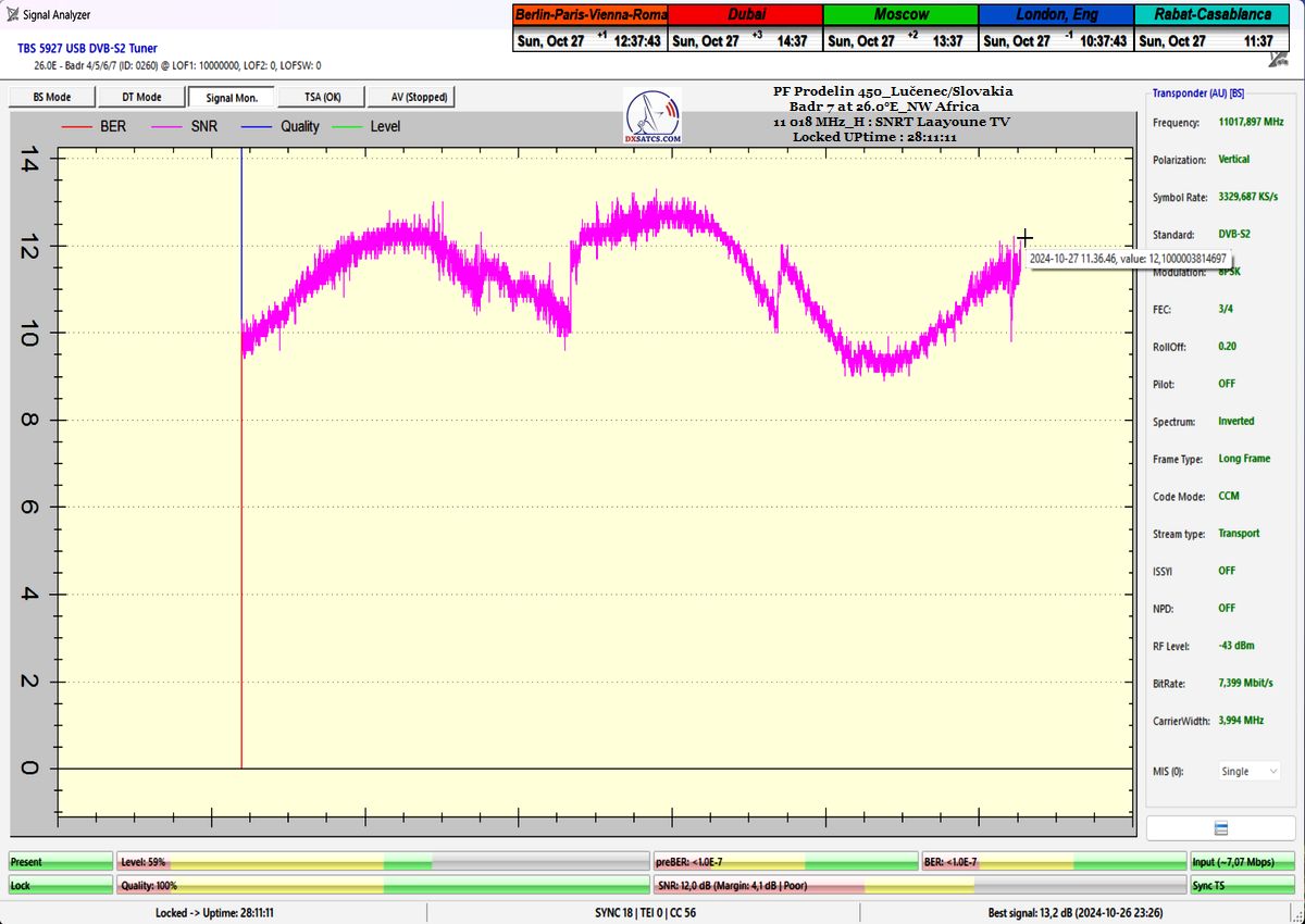 ►►Badr 7 at 26.0°E-Northwest Africa : Continuous signal monitoring / Nepretržitý signálny monitoring