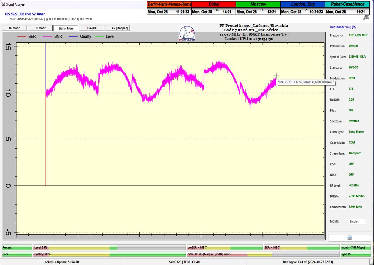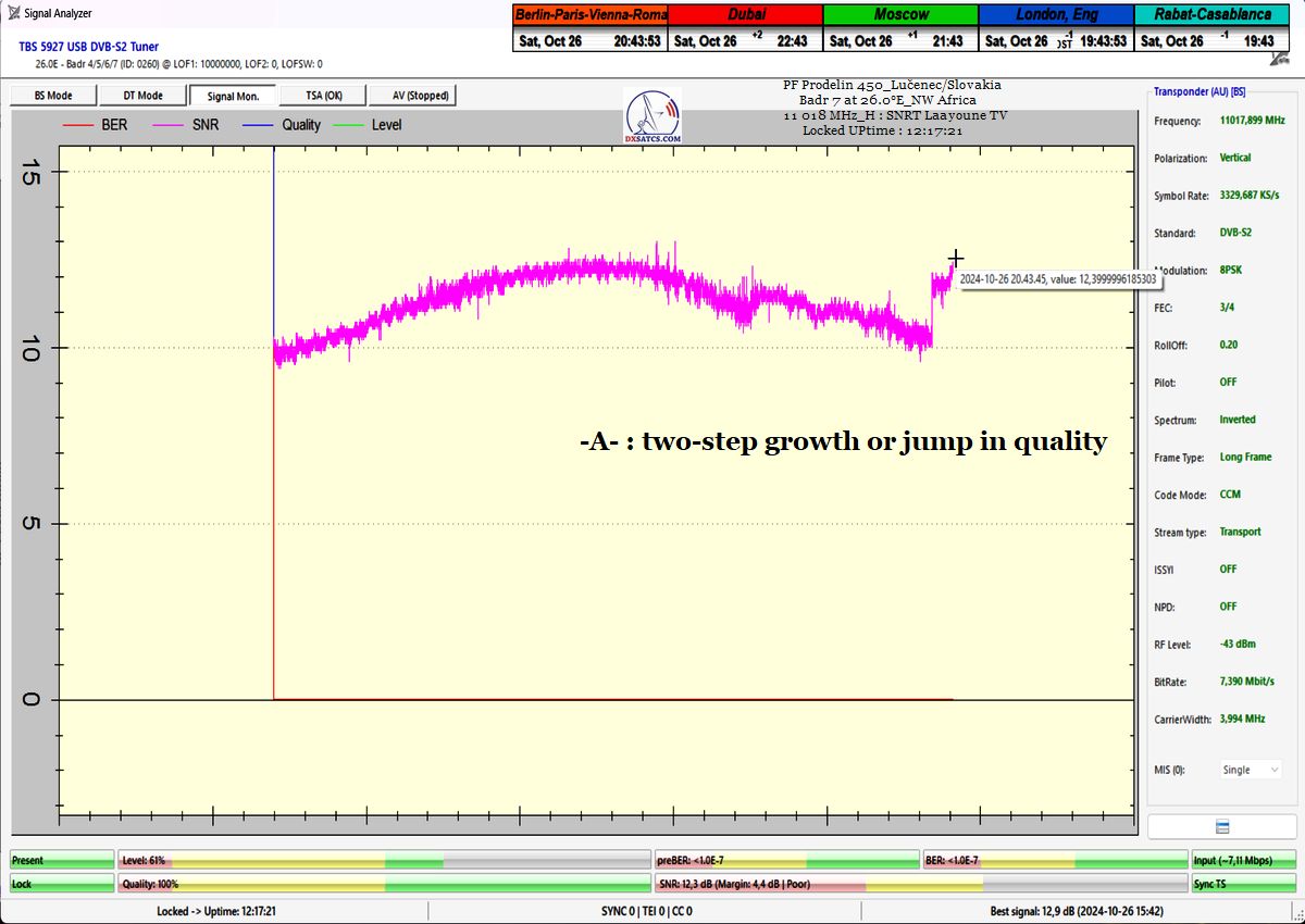 signálnej kvality o 1-3,6 dB ale hlavne kontinuitu/stabilitu Locku nosnej pri vysokých a každodenných zmenách výkonu v strednej Európe. Plnú stabilitu príjmu na 100% a kontinuitu