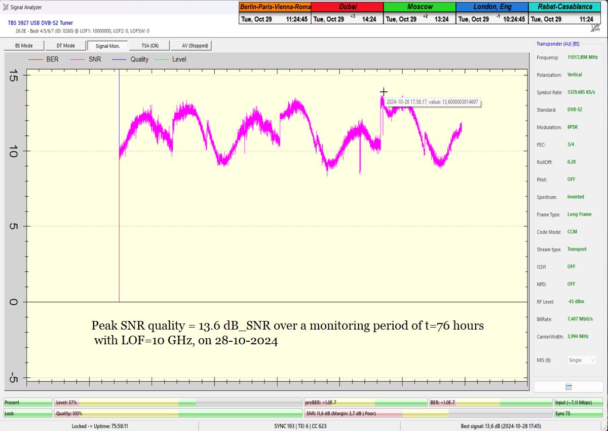 conditions and the SMW-brand LNB used, peak quality ranged from 13.6 dB (at t=76 hours and LOF=10 GHz) to 14.2 dB_SNR (at t=21 hours and LOF=9.75 GHz).