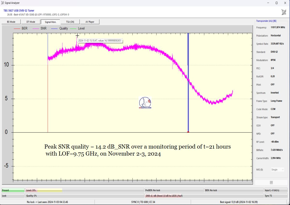 V závislosti od poveternostných podmienok a od použitého LNB značky SMW špička kvality dosahovala úrovní od 13,6 dB (pri t=76 hodín a LOF=10 GHz) do 14,2 dB_SNR