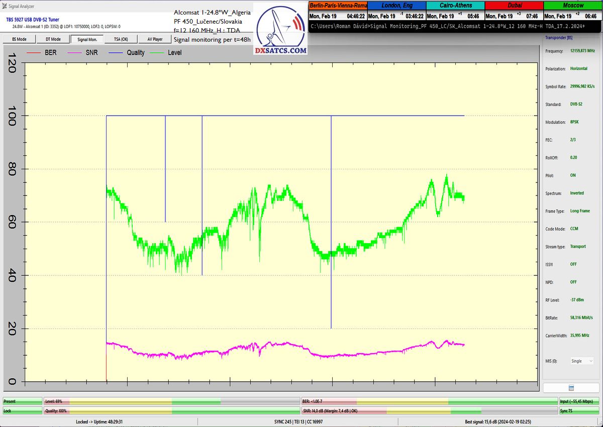 28.2.2024 : Author Roman Dávid is the first in Europe to achieve stable reception at 100% without a single dropout in the continuity of the Lock carrier with peak quality SNR=15.6 dB at the monitored frequency f=12 160 MHz in the geographical location of Central Europe and in the verification unit of t=72 hours with a reflector of a given diameter,provided by the Algerian provider TDA from the Alcomsat 1 satellite at 24.8°W.