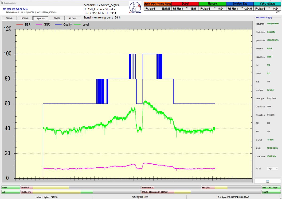 13.3.2024 :The author Roman Dávid is the first in Europe who,with a given diameter of the reflector,in a specific geographical point in Central Europe and in the verification unit of monitoring for t=72 hours,unquestionably demonstrated the achievement of a stable reception at 100% without a single outage in the continuity of the lock on the monitored frequency f=12 250 MHz of the satellite Alcomsat 1-24.8°W.