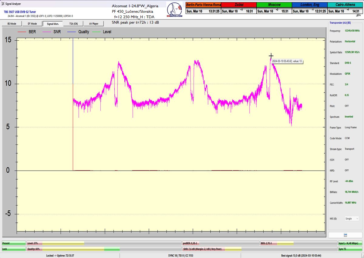 Kontinuálny signálny monitoring týmto dokazuje každodenný výskyt špičky kvality od 12,6 do 13,0 dB_SNR (TBS 5927) v závislosti od okamžitých poveternostných podmienok v atmosfére na frekvencii alžírskeho provajdera TDA f=12 250 MHz_H
