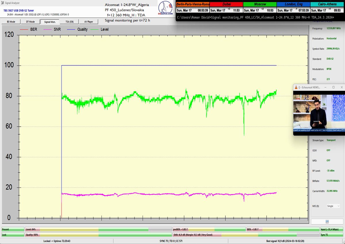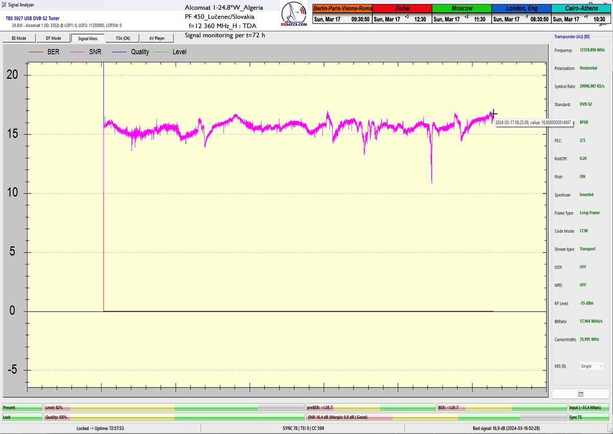 ►De_Klassifizierung der erreichten Ergebnisse bei f=12 360 MHz: Die visualisierte Form des Beweises im Signalmonitoring über eine Einheit von t=72 Stunden,ausgedrückt in Leistungs, Qualitäts und Fehlerverlaufs Trends,demonstriert und beweist gleichzeitig das Erreichen eines vorbildlichen Zustands des Satellitenempfangs,im Sinne eines Zustands,der als MUSTER dienen kann.Die nachgewiesene Empfangsstabilität von 100% mit einem hohen und typischen Qualitätsreserveniveau während des gesamten Tages erreichte Werte von 8 bis 10,4 dB in der Link/Rauschabstand-Messeinheit.Die Kontinuität aller überwachten Einheitstrends wurde durch zwei Wellen von Regenschauern mit relativ hoher Niederschlagsintensität am 16.März 2024 verifiziert.Die täglichen Qualitätspeaks erreichten Werte von 16,7 bis 17,0 dB in der SNR-Einheit und traten in zwei Intervallen auf: von 02:15 bis 02:45 nachts und von 8:45 bis 9:45 morgens.Auch im Fall der Überwachung der Frequenz f=12 360 MHz wurde die endgültige Form der Überwachung bereits beim ersten Versuch erreicht,ähnlich wie dies bei allen anderen Trägern des Satelliten Alcomsat 1 der Fall war.