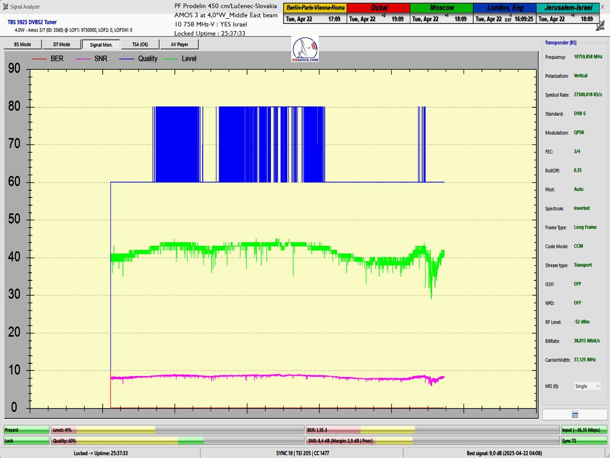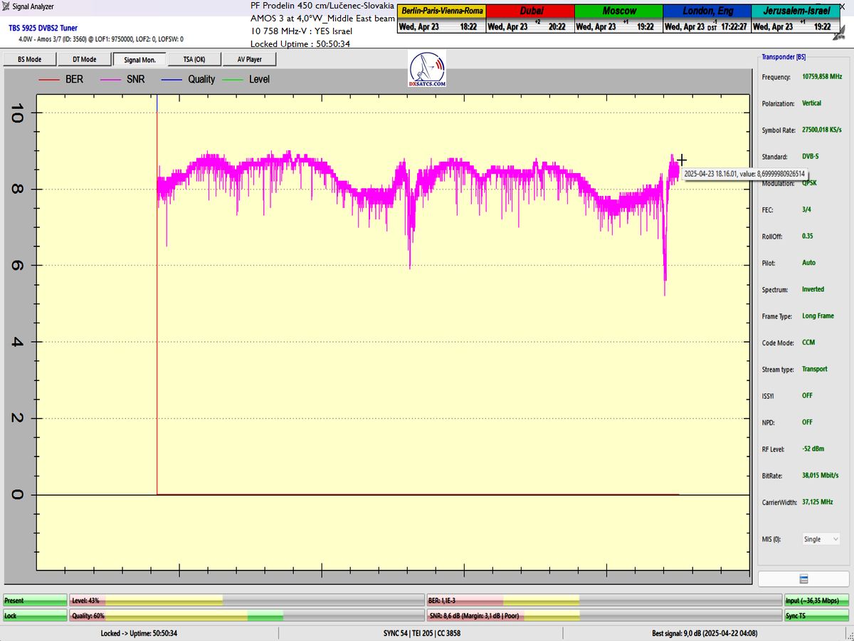 ►►Amos 3 at 4.0°W-Middle East-10 758 MHz-V_YES Israel : Analysis of signal monitoring over a duration of t=73 hours