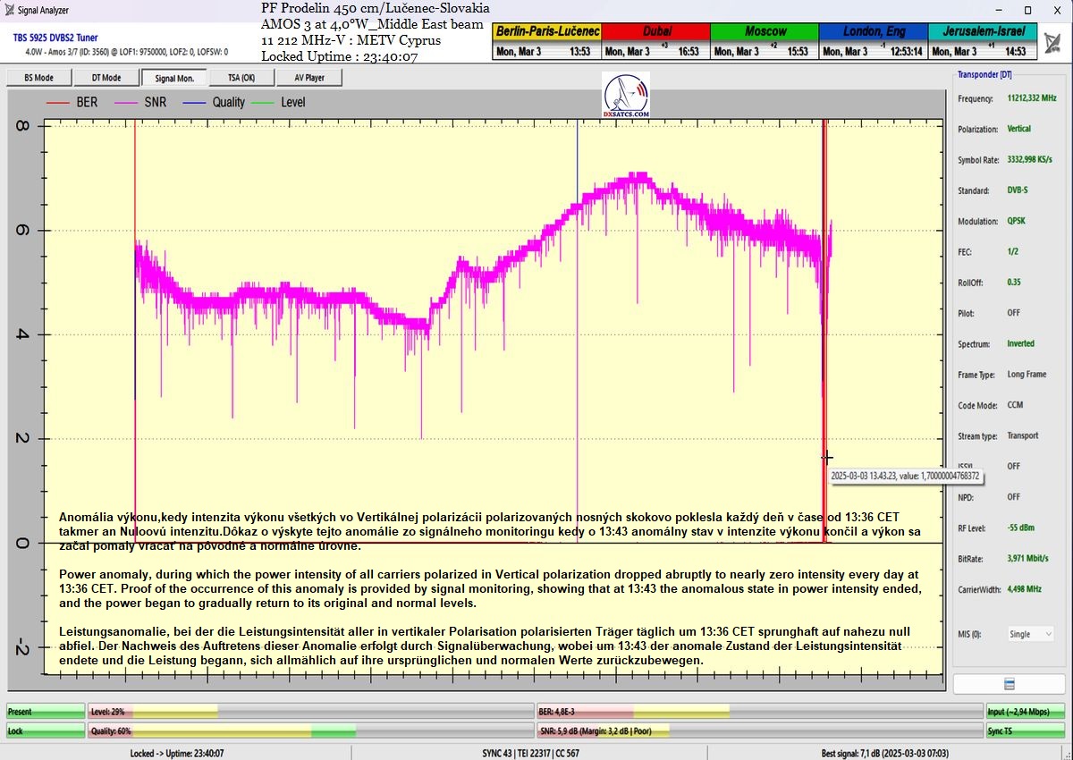 demonstrably stable satellite reception of METV at f=11,212 MHz, is a one-second pixelation or stream freeze, nothing more, and even that occurs typically under deteriorated weather conditions without a single continuity loss of the carrier lock. Subsequently, I will identify and prove the occurrence of a power anomaly, which repeated itself almost every day for eight consecutive days at the same time, from 13:35 to 13:42 CET. I am unable to influence its course and occurrence in any way, since it is related to the movement and trajectories of celestial bodies, which interfere with the trajectory of the electromagnetic wave of the Amos 3 satellite, and typically, just as it appears, it also spontaneously disappears and ceased precisely on Thursday, March 6, 2025.The course and daily occurrence of the power anomaly will then be analyzed in detail, as its appearance is clearly documented in the signal monitoring.
