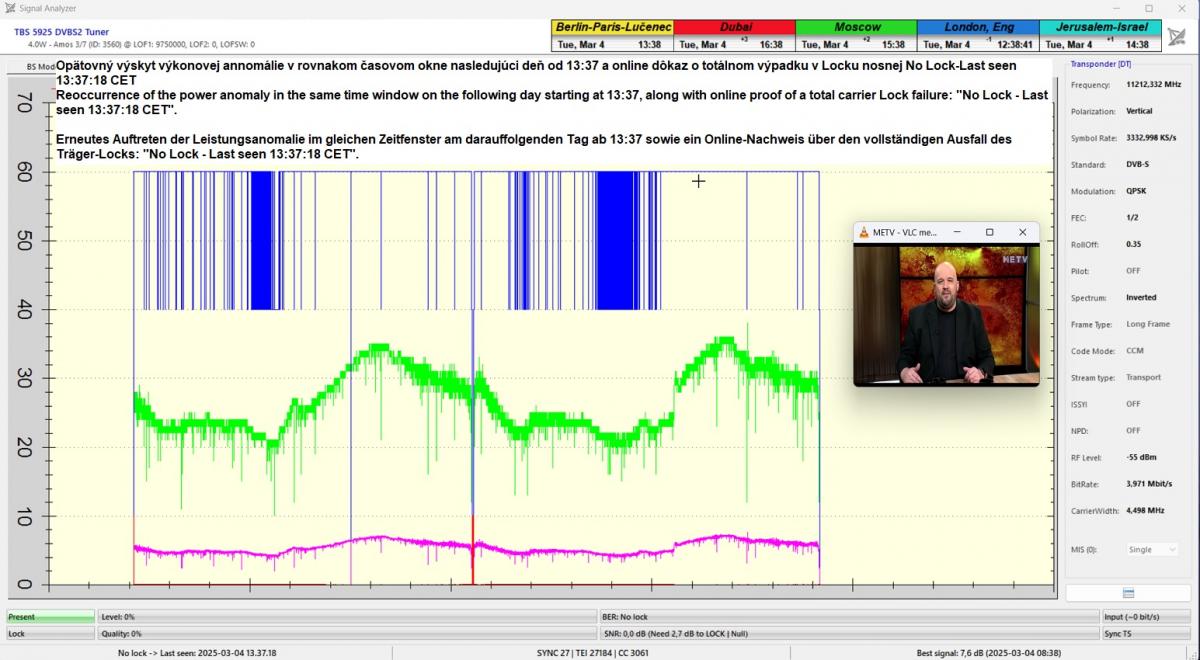 v dĺžke minúty maximálne jednotky hodín denne čo samozrejme nikto príčetný nemôže pomenovať označením príjem ako taký.V mojom prípade sú moje tvrdenia o stabilite príjmu na viac ako 99,99% nespochybnitelne verifikované,alebo dokázané v signálnom monitoringu s dostatočnou jednotkovou dĺžkou t=72 hodín a na základe týchto výsledkov môžem tvrdiť že jediným negatívnym faktorom,ktorý krátkodobe a typicky len na jednu sekundu degraduje môj dokázateľne stabilný satelitný príjem METV na f=11 212 MHz je sekundová pixelácia,alebo zamrznutie streamu,nič viacej,aj to pri typicky zhoršených poveternostných podmienkach bez čo i len jedného výpadku v kontinuite Locku nosnej. Následne pomenujem a dokážem výskyt výkonovej anomálie ktorá sa takmer 8 dní opakoval každý deň v rovnakom čase od 13:35 do 13:42 CET.