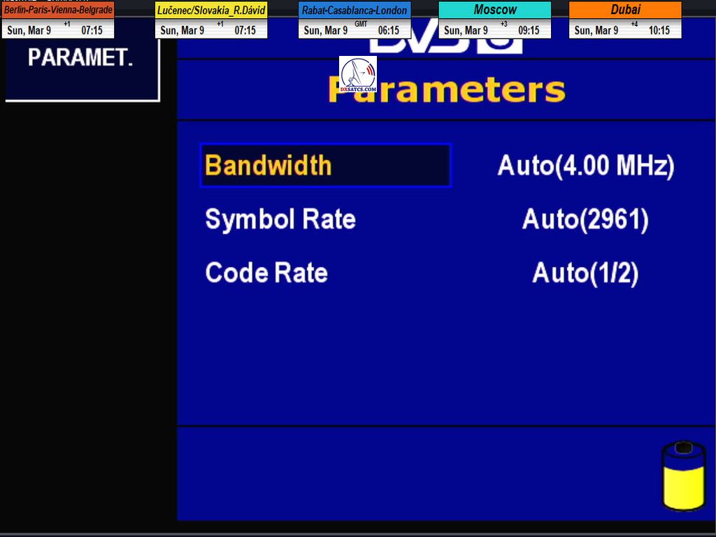 > Current Transmision parameters : DVB-S _ QPSK _ SR=2 963 _ FEC=1/2 <