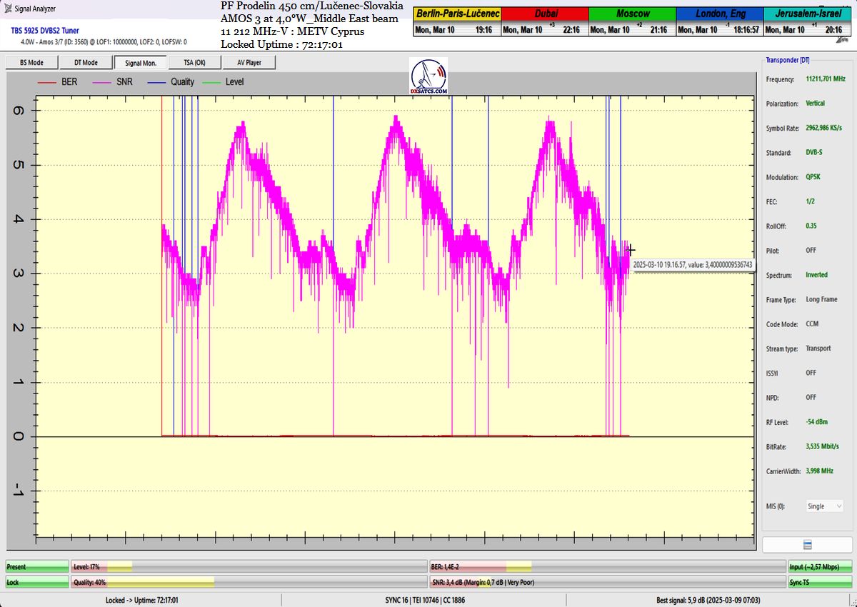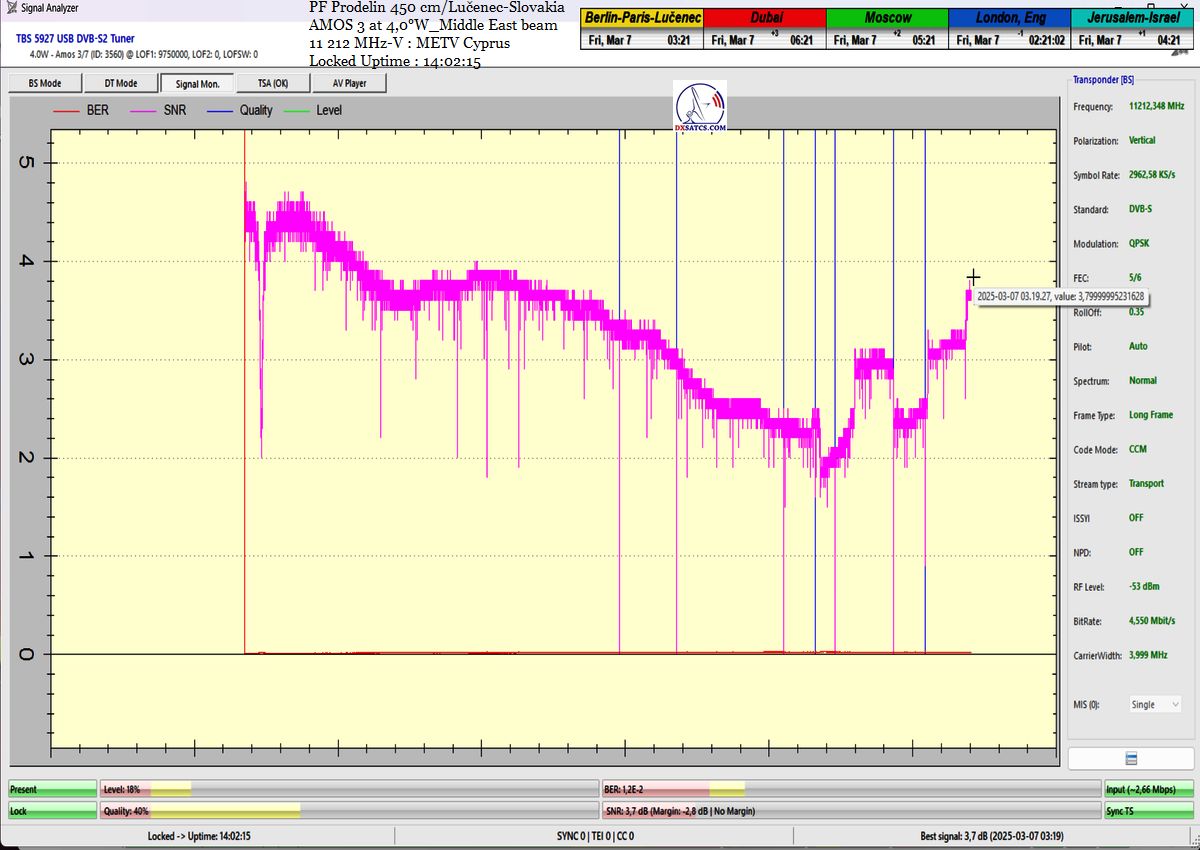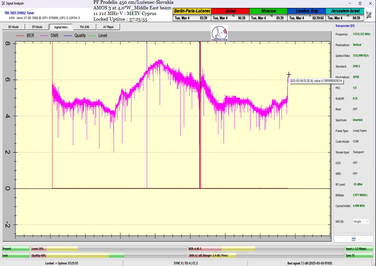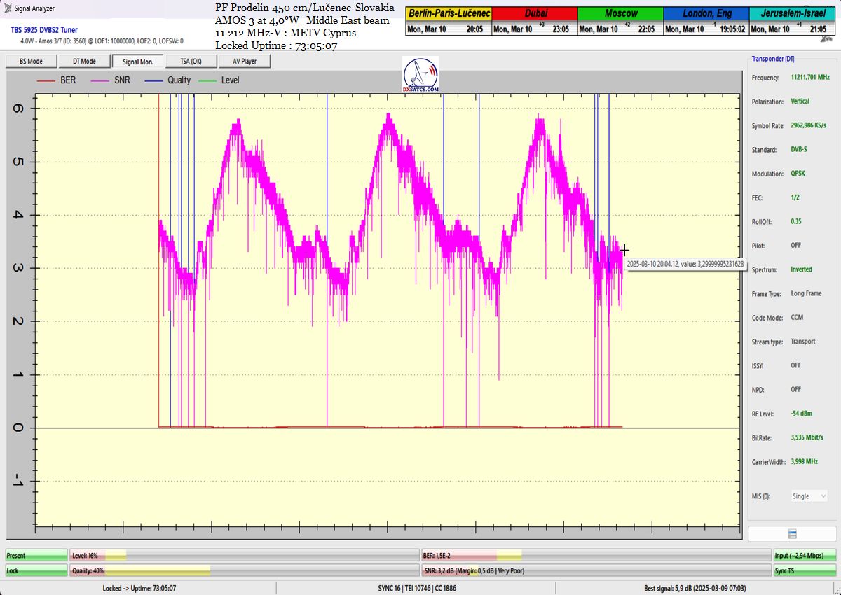 ►EN_Author Roman Dávid and his scientific-research center today publish, as the first in Europe, indisputable results of analyses concerning the achieved quality and, above all, the stability of 99.99% carrier signal reception of METV at f = 11,212 MHz_V from the satellite Amos 3. These results are verified and proven by a 72-hour signal monitoring unit using a PF 450 cm antenna for the geographic area of Central Europe, specifically regarding the possibility of satellite reception from the Middle East beam, after the parameter of Symbol Rate SR was changed to the current value of SR = 2,963 ksym/sec on March 5, 2025.