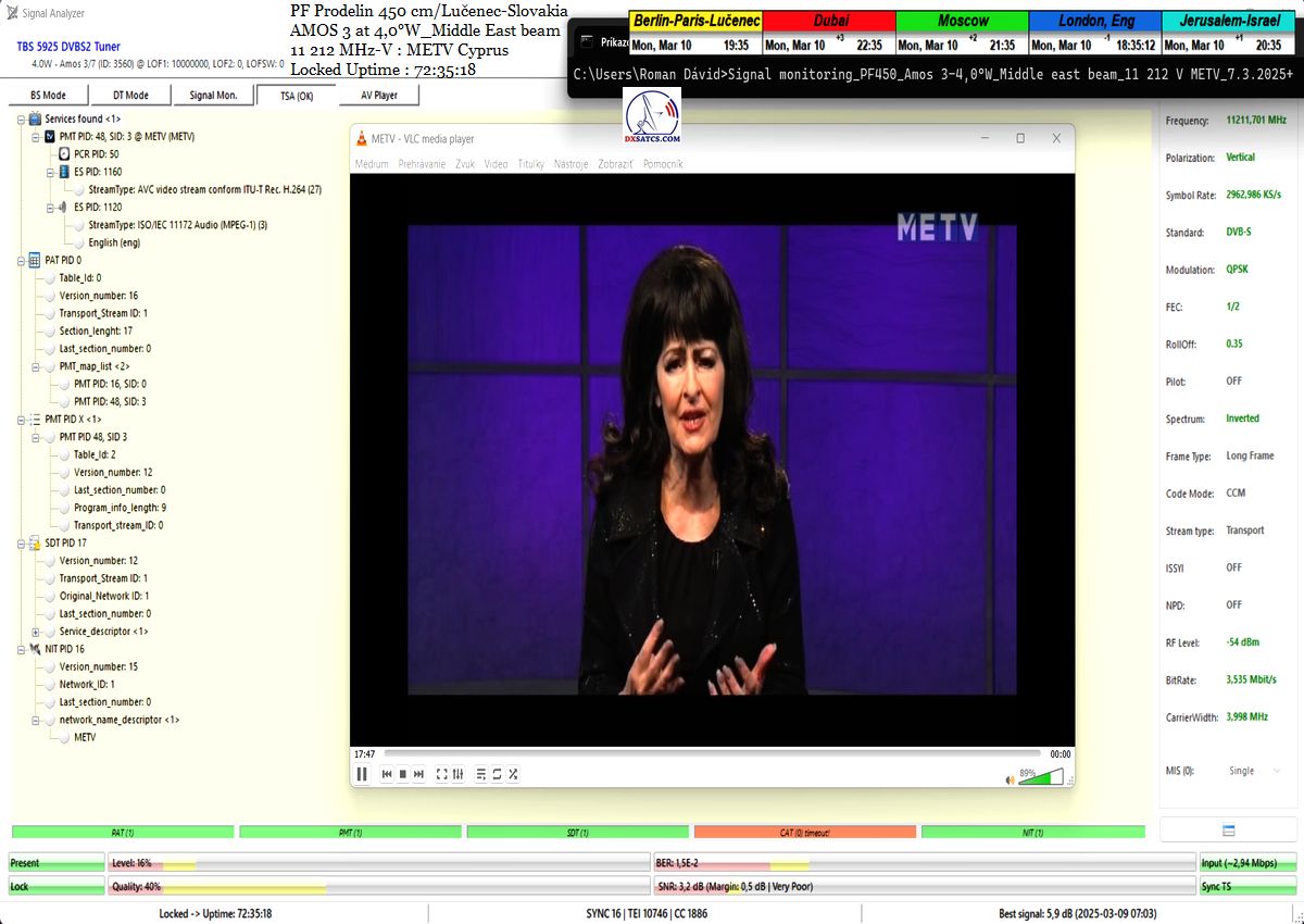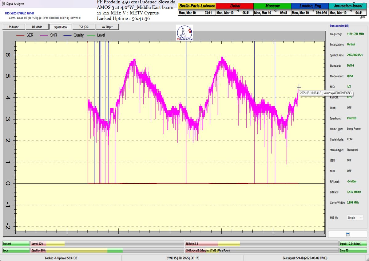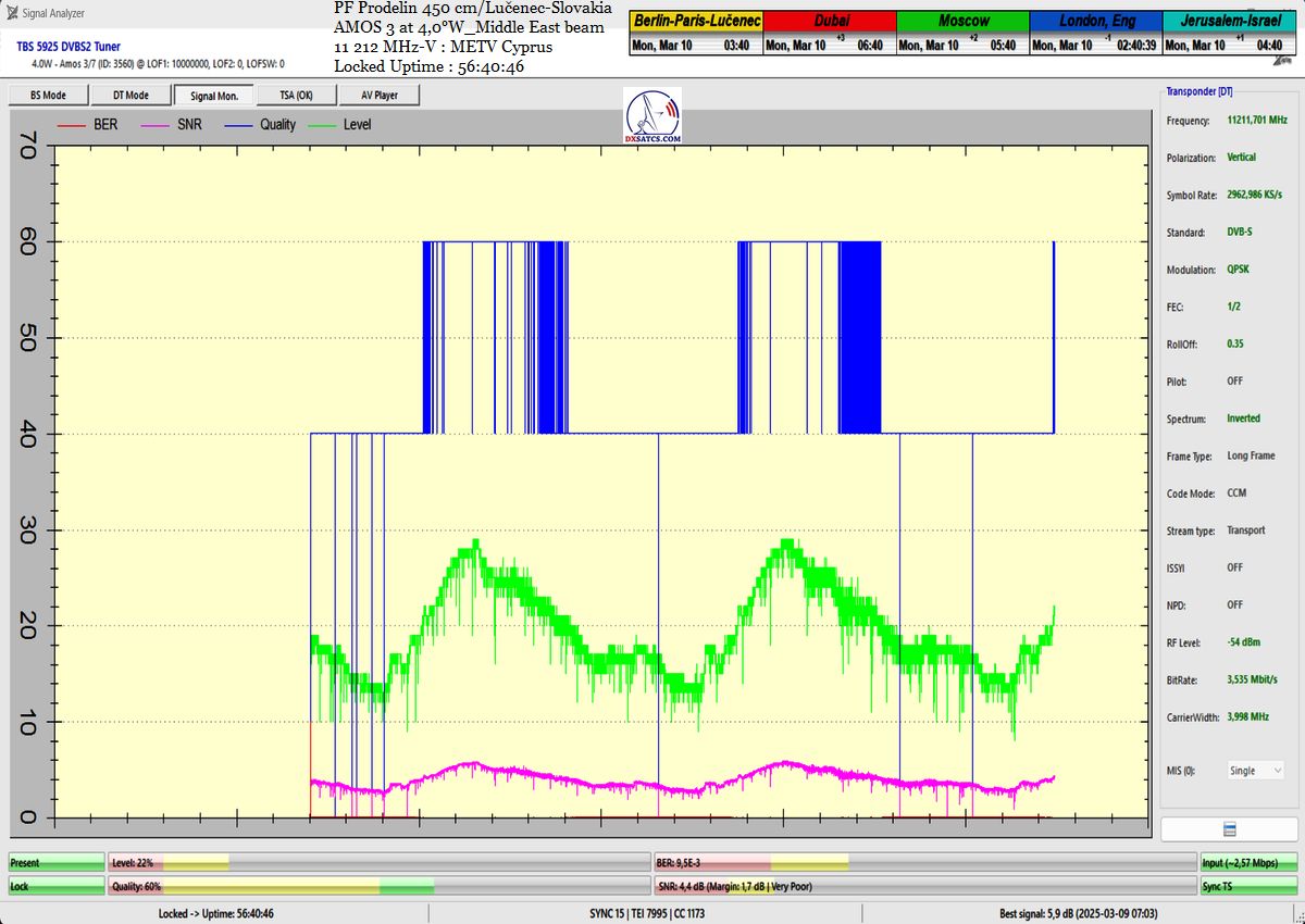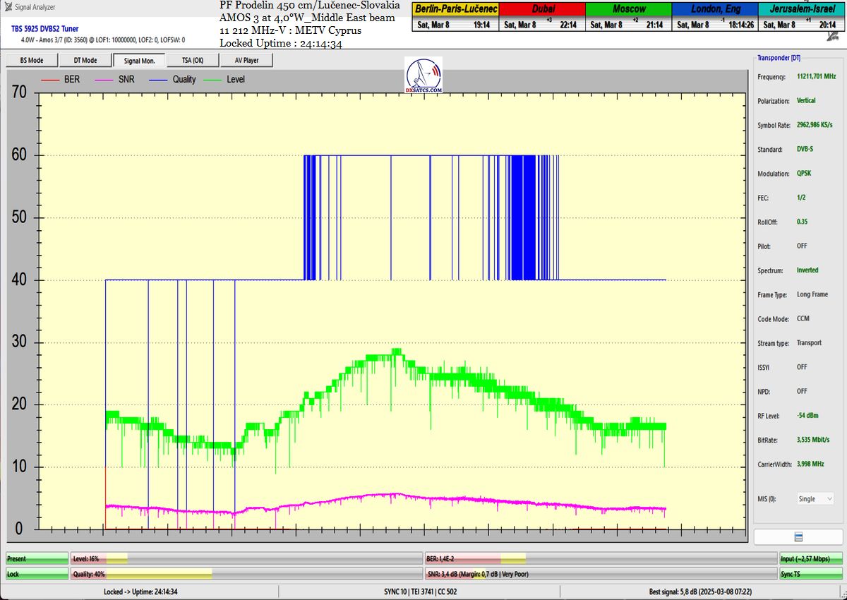 ►EN_Author Roman Dávid and his scientific-research center today publish, as the first in Europe, indisputable results of analyses concerning the achieved quality and, above all, the stability of 99.99% carrier signal reception of METV at f = 11,212 MHz_V from the satellite Amos 3. These results are verified and proven by a 72-hour signal monitoring unit using a PF 450 cm antenna for the geographic area of Central Europe, specifically regarding the possibility of satellite reception from the Middle East beam, after the parameter of Symbol Rate SR was changed to the current value of SR = 2,963 ksym/sec on March 5, 2025.