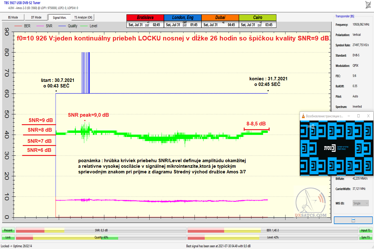 ⇒3,f0=10 926 MHz_V : pre geostacionárne objekty Amos 3/7 tak typický faktor takmer nepretržitej a relatívne vysokej oscilácia mikrovýkonupočas dňa,v celej stredoeurópskej zóne príjmu,od približne 10:00 do približne 19:00 SEČ sa demonštruje v HRÚBKE KRIVIEK PRIEBEHOV jednotiek SNR a Level v grafe signálneho monitoringu,čiže platí : Čím tenšia je krivka priebehov SNR/Level tým menšia je amplitúda okamžitej oscilácia mikrovýkonu a kvality v mieste analýz. V časovom úseku od približne 10:00 do približne 19:00 SEČ je možné neperiodicky identifikovať aj aplitúdu oscilácie v rozsahu SNR=+/- 0,5 dB čiže prakticky