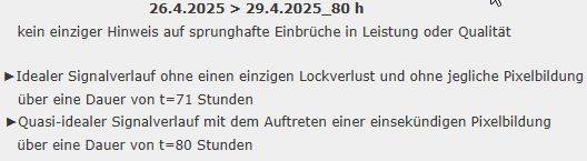 Die Ergebnisse des Signalmonitorings über eine Dauer von t = 80 Stunden belegen zweifelsfrei, dass ich, nachdem ich die Ursachen für das Auftreten der Anomalie auf jeder Frequenz im Spektralbereich von 10.722 bis 10.926 MHz_V beseitigt hatte, nun einen quasi-idealen Empfangsverlauf mit 100 % Stabilität erreicht habe – ohne jegliche Pixelbildung, Einfrieren oder Lock-Ausfall während eines Monitorings von t = 71 Stunden – sowie einen quasi-idealen Empfangszustand mit lediglich einer einsekündigen Pixelbildung während eines Monitorings von t = 80 Stunden. Ich habe dieses Ergebnis als zufriedenstellend bewertet und das Monitoring daher nicht erneut von vorne begonnen, da es keinen Sinn ergibt, sich im Detail mit einer einzigen einsekündigen Pixelbildung von insgesamt 288.000 überwachten Sekunden zu beschäftigen. Die Ursache könnte beliebig sein – zum Beispiel der Vorbeiflug eines Vogels, das Vorhandensein eines Insekts am Feedhorn usw.