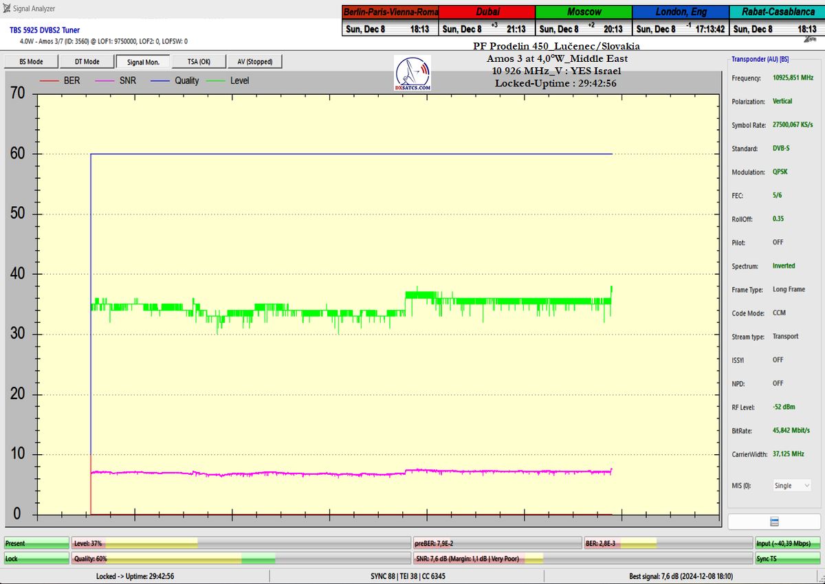 Die kontinuierliche Signalüberwachung der Frequenz f = 10,926 MHz über eine ausreichende Zeiteinheit t = 80 Stunden mit einzigartigen ursprünglichen israelischen FTA-Signalausstrahlungen (z. B. Knesset Channel), die weltweit ausschließlich auf dieser einzigen Frequenz im Middle-East-Diagramm des Satelliten Amos 3 bei 4,0°W ausgestrahlt werden, hat gezeigt, dass ich eine Empfangsstabilität von 100 % erreicht habe – ohne eine einzige Pixelbildung oder einen Verlust des Träger-Locks, selbst bei Schnee- und Regenschauern. All dies ist das Ergebnis der erfolgreichen praktischen Anwendung der Vorteile meiner technologischen Erfindung Synchrone Nanokorrekturen im Satellitenempfang.