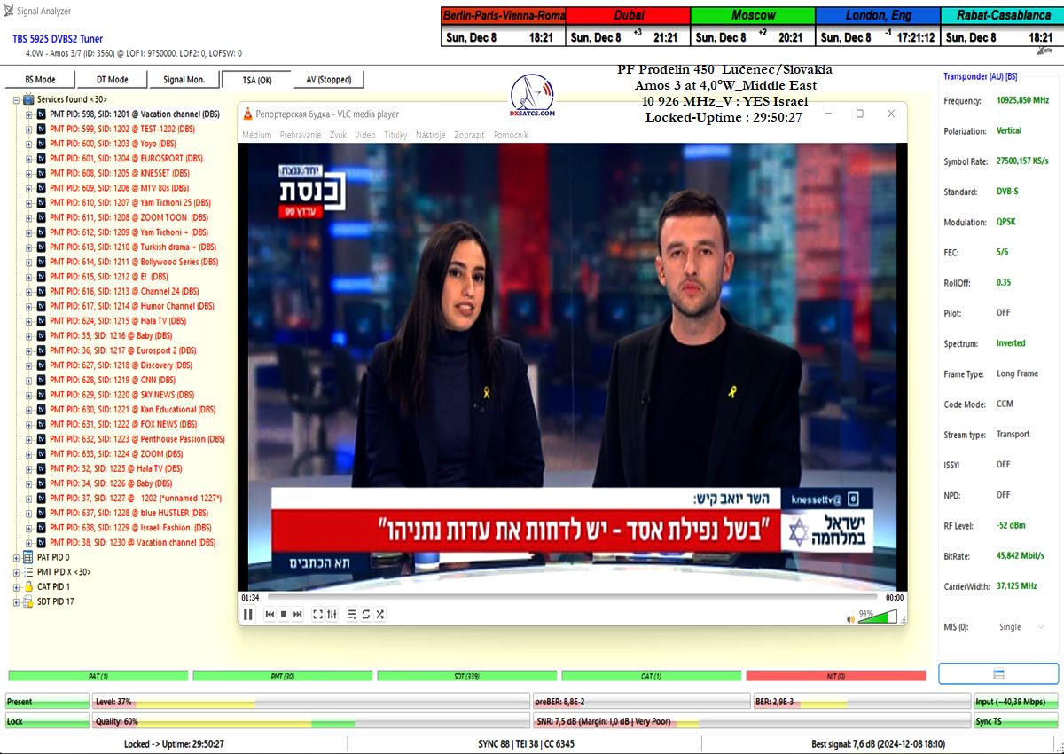 ►+29 hodín _ Priebežný stav v signálnom monitoringu dňa 8.12.2024 a online video ukážky z vysielania v ktorých nie je možné pozorovať ani jeden výpadok alebo pixeláciu obrazu