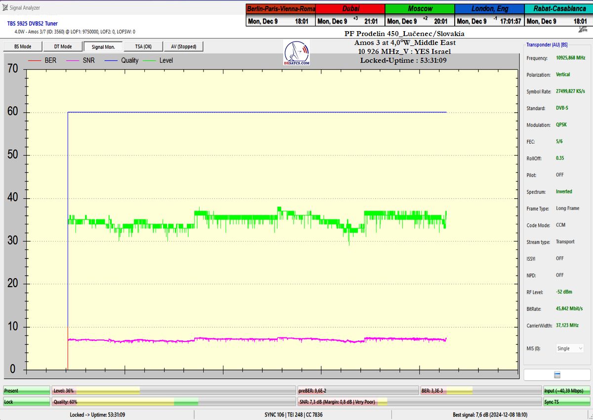 ►SK_Test funkcie môjho originálneho technologického vynálezu s názvom "Synchrónne Nanokorekcie" pri nulovej,alebo takmer nulovej úrovni signálnej rezervy a dokázaná stabilita príjmu na 100% v jednotke dokazovania t=80 hodín bez jedinej pixelácie na nosnej prenosu YES Izrael_f=10 926 MHz aj pri snehových a dažďových prehánkach ako dôsledok ultra presnej replikácie signálneho modelu do anténneho systému.