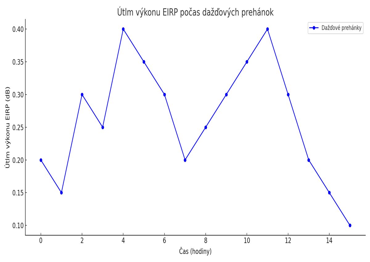 Pri nízkych hodnotách zrážok (0,1 – 0,3 mm/hod) je útlm EIRP relatívne mierny, no stále zaznamenateľný.