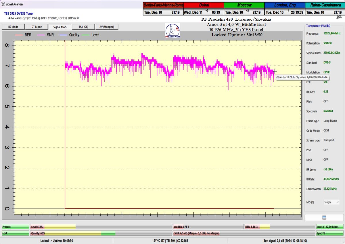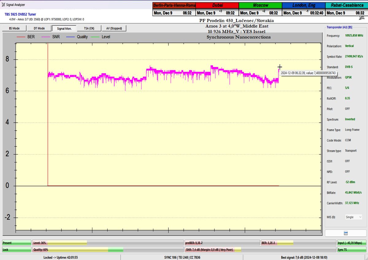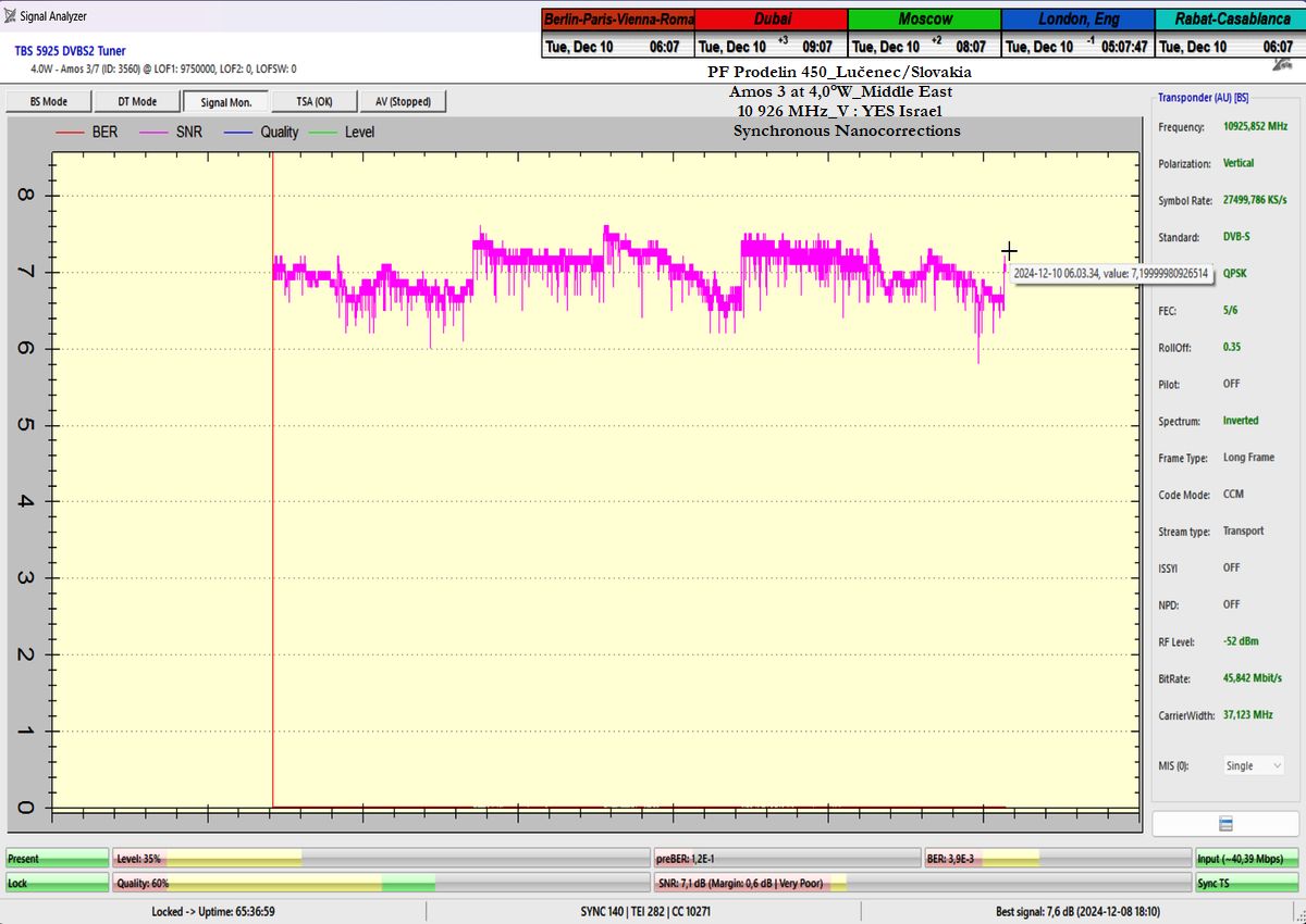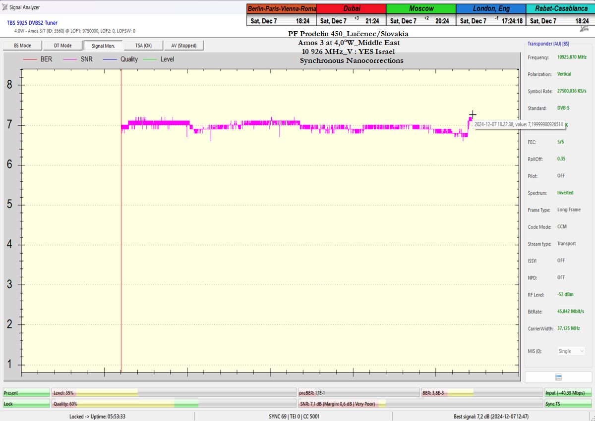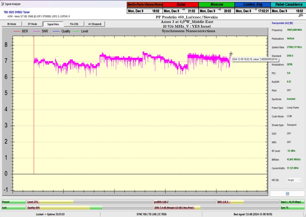 question the relevance of the result due to a short monitoring duration. I fully agree that sufficient evidentiary weight undoubtedly holds the highest importance or priority in proving the reception stability of a carrier available only in microintensity EIRP performance in the geographic area of Central Europe. This region is particularly characterized by highly dynamic changes in power intensities within the non-guaranteed "Out of Footprint" zone.As evidenced by the progression of signal monitoring, a peak quality at the level of SNR=7.6 dB was demonstrated after the successful application of my technology, "Synchronous Nanocorrections", following my update and rewriting of system data. The timeliness and accuracy of these data were thereby verified by the subsequent achievement of this peak in quality.