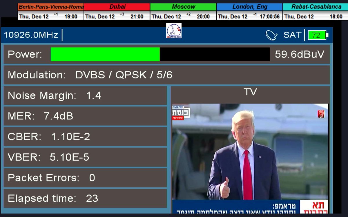 ►DE_Der Test meiner originellen technologischen Erfindung mit dem Namen „Synchrone Nanokorrekturen“ bei null oder nahezu null Signalreserve hat eine 100%ige Empfangsstabilität über eine Nachweiszeit von t=80 Stunden ohne einen einzigen Pixelierungsfehler auf dem Übertragungsträger YES Israel _f=10 926 MHz gezeigt. Diese Leistung wurde selbst bei Schnee- und Regenschauern durch die ultrapräzise Replikation des Signalmodells in das Antennensystem erreicht.