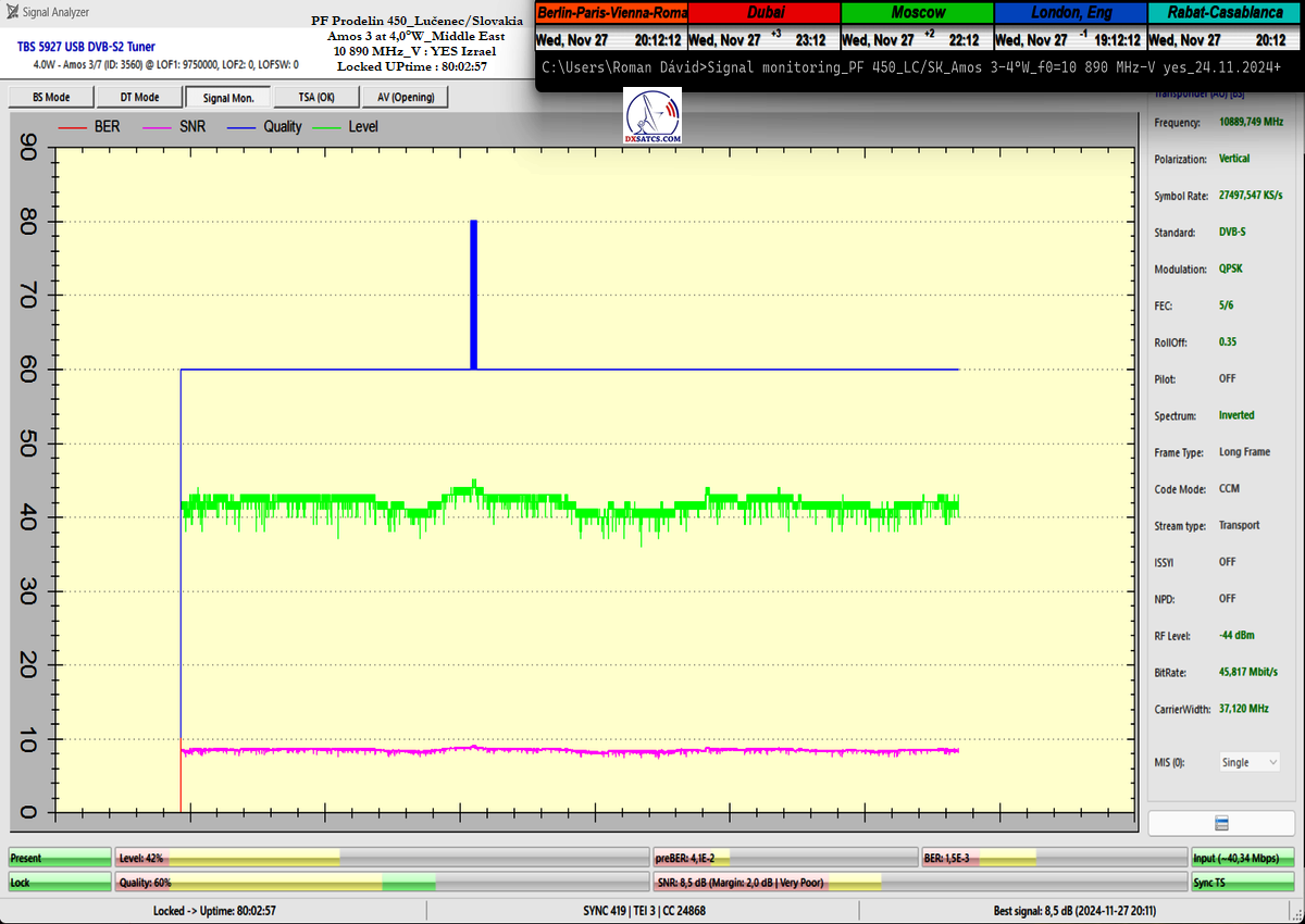 ►11 091 MHz_H _ METV_ plná stabilita príjmu až do t=50 hodín bola prerušená výpadkom Locku pri letnej búrke dňa 3.6.2024 od približne 15:40 do 17:00 CET + dôkaz č. 1-2 pri špičke kvality SNR=6,9 dB + dôkaz . Počas leta 2024 som pracoval na malej korektúre v sytémovom riešení v ohnisku PF 450 cm a pri tej príležitosti som si testoval správnosť mojich postupov pri signálnom monitoringu METV na f=11 091 MHz z Amos 7,aby som následne pochopil že atribút referenčnosti musí byť odňatý tejto frekvencii na základe výsledkov monitoringu a následne som atribút referenčnosti priradil práve f=10 890 Mhz_V pre celý diagram Middle East .