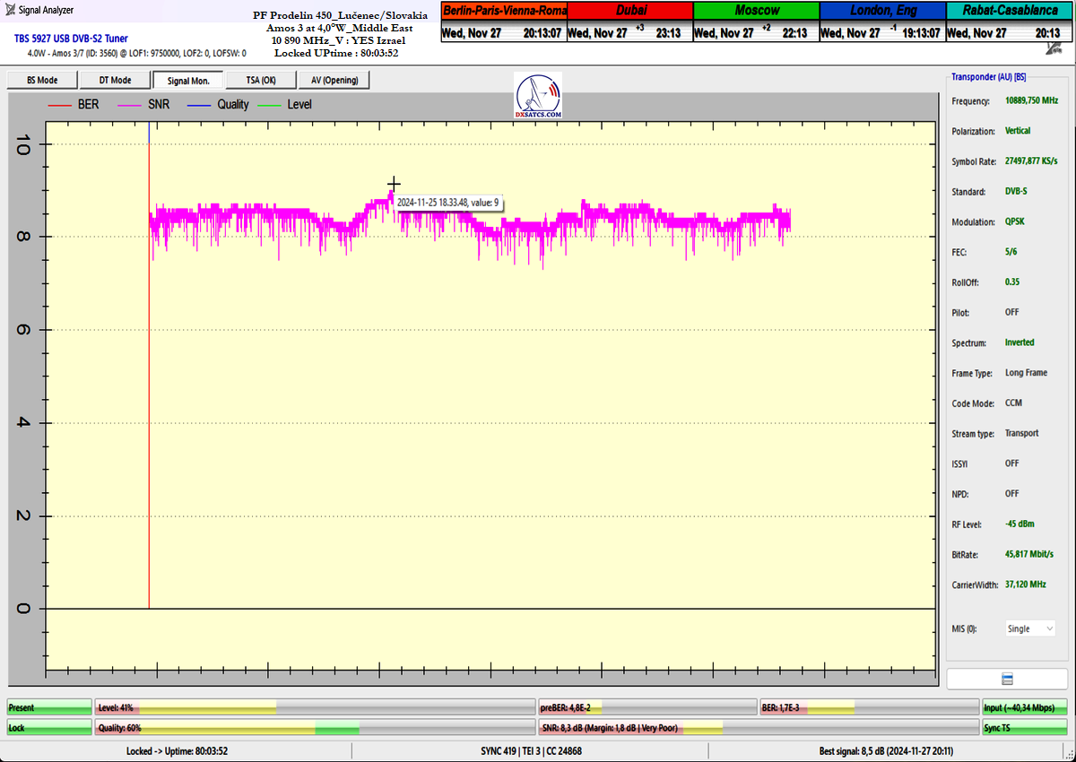 concerning the immediate signal availability of transmissions powerfully focused on the Middle East region at any second of the day. Thanks to my "Synchronous Nanocorrection" technology, there was a consistently low but stable signal margin of 1.0 to 2.5 dB/SNR during a monitoring period of t=80+ hours. Not once during this time did the signal approach the noise threshold for Lock at SNR=6.5 dB, and satellite reception remained fully stable, even under overcast skies with light rain showers.