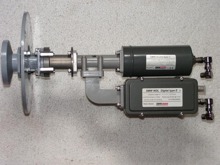 FOTOGALÉRIA č.5 : Kompletná vonkajšia signálna jednotka na príjem cirkulárnej polarizácie z družice BONUM 1 na 56°E,ktorú navrhol autor webu dxsatcs.com na dosiahnutie plného signálneho prenosu z ohniska antény CHANNEL MASTER RX 300 cm s minimálnym činiteľom stojatého vlnenia ČSV , s vysokým oddelením polarizačných rovín CROSS POLAR ISOLATION za depolarizačným vlnovom SMW XD12 a na zákazku vyrobeným jednopolaritným LNB SMW WDL DIGITAL DUAL OUTPUT DRO s LOF stabilitou +/- 1,5 MHz