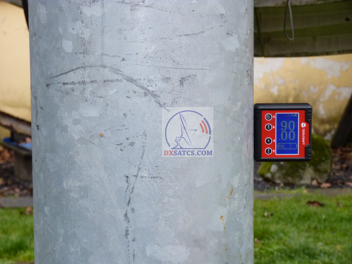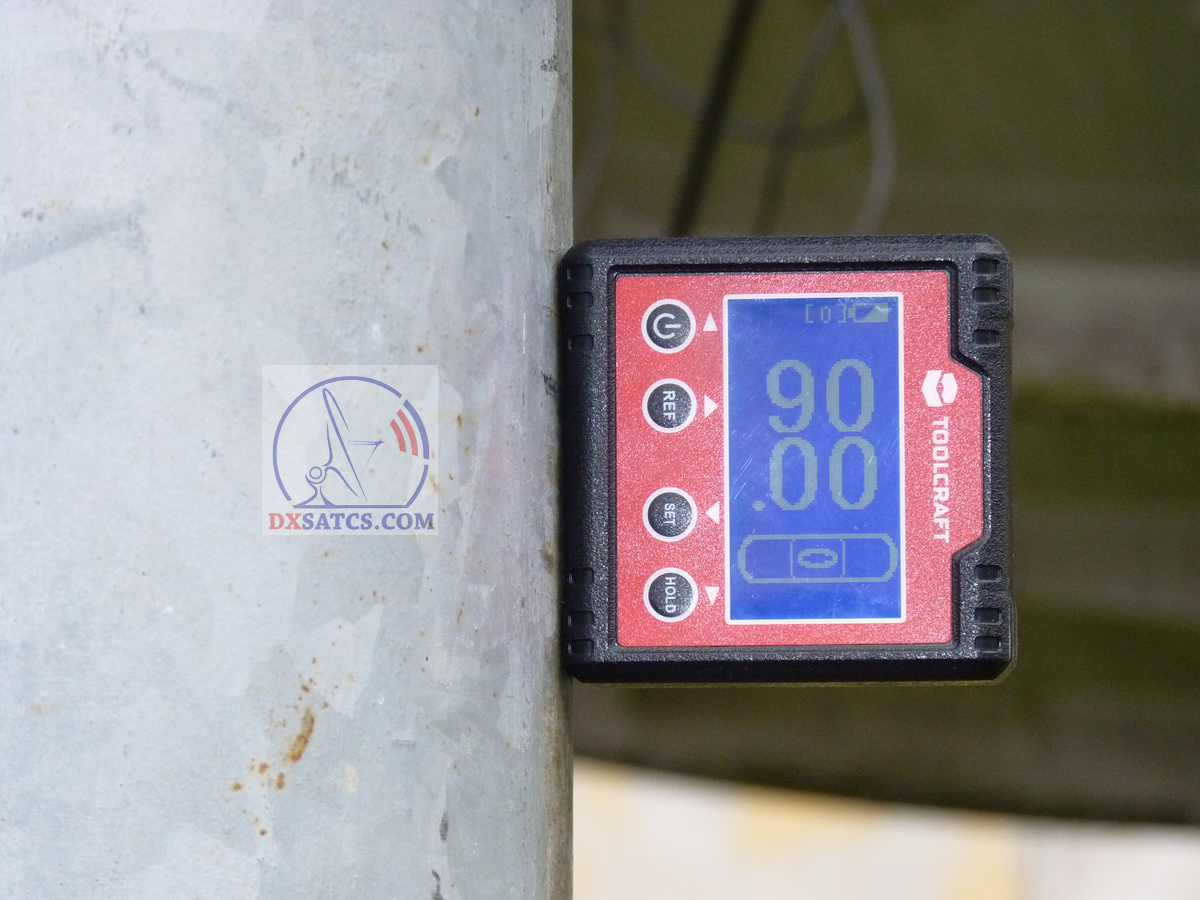 Digitálny dvojosý (X+Y) uhlomer s rozlíšením 0,01° a presnosťou ±0.1° verifikuje dosiahnutie inštalačnej kolmosti a stabilitu statívu účinne vyváženého anténneho systému Prodelin 450 cm s hmotnosťou okolo 670 kg aj so závažím.Inštalačná kolmosť,stabilita statívu a účinné vyváženie v smeroch N-S a E-W sú nevyhnutným predpokladom pre presný a plne manuálny výkon autorovho technologického postupu "Synchrónnych nanokorekcii" s mimoriadne vysokou náročnosťou na presnosť a stabilitu zmien vykonaných korekcií .