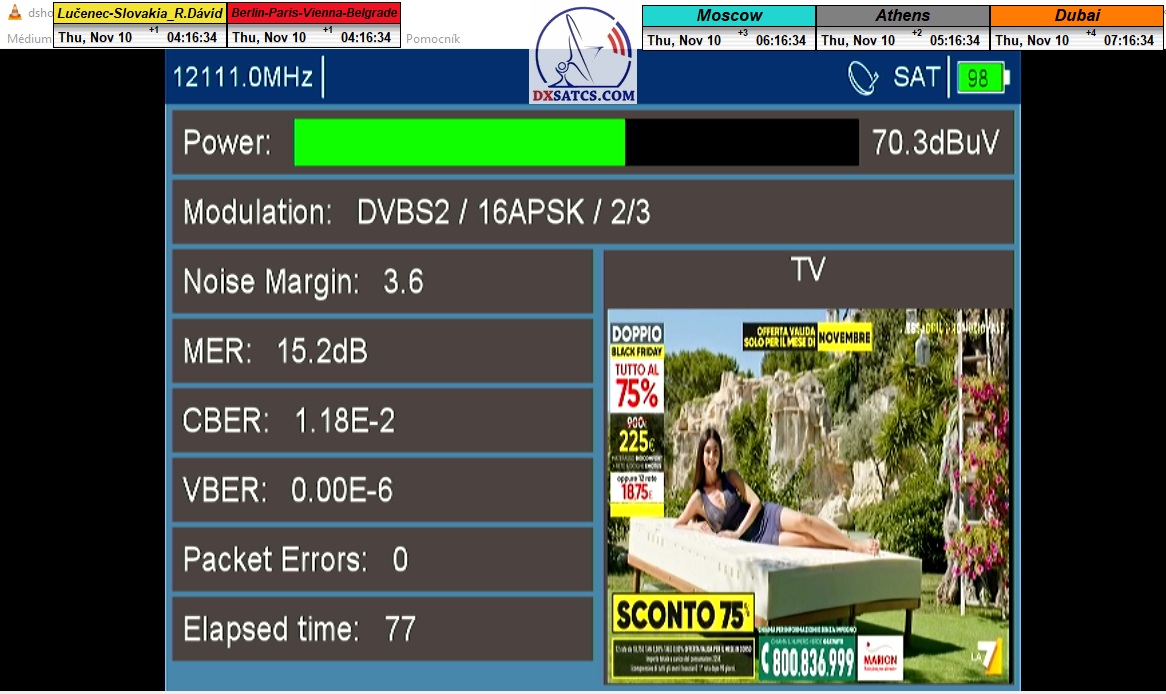 ►v signálnom monitoringu dokázaný a plne stabilný príjem bez jediného výpadku za jednotku t=72 hodín,pri častých dažďových prehánkach a každodenne dosiahnutá špička kvality okolo SNR=13,8 dB s tunerom TBS 5925/5927 alebo okolo MER=14,2 s analyzátorom Metek HD na f=12 111 V .