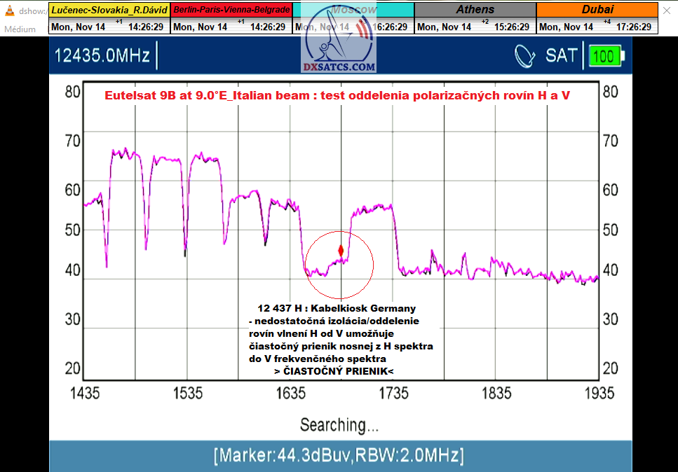 satelitov a hladinami EIRP=50-55 dBW,čo sú konkrétne v tomto prípade vlnenia vysielané v horizontálnej polarizácii. Pri výrobcom presne (ne)stanovenej , len "mlhavej-nekonkrétnej" hodnote izolácie H od V roviny , citujem "je vyššia ako 25 dB" síce bolo možné ! len nestabilne ! LOCK-núť všetkých 5 nosných pri amplitúde kvality okolo SNR=10-12 dB,ale výpadky v kontinuite LOCK-u a pixelácia obrazu boli TRVALÉ. Inými slovami univerzálny princíp výberu a izolácie rovín vlnení ÚPLNE ZLYHAL,alebo inak povedané žiadna kvalita ale len nestabilný LOCK s trvalo oscilujúcou amplitúdou ne-kvality PER/MER/SNR.