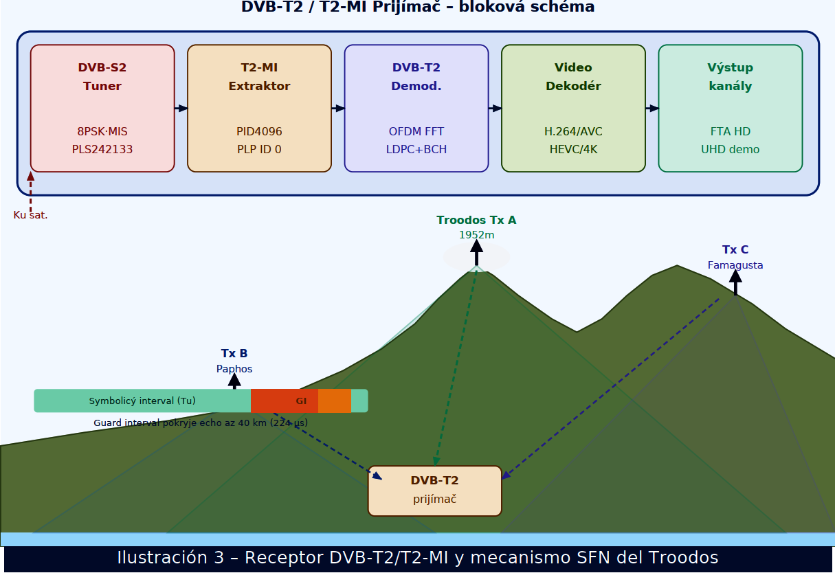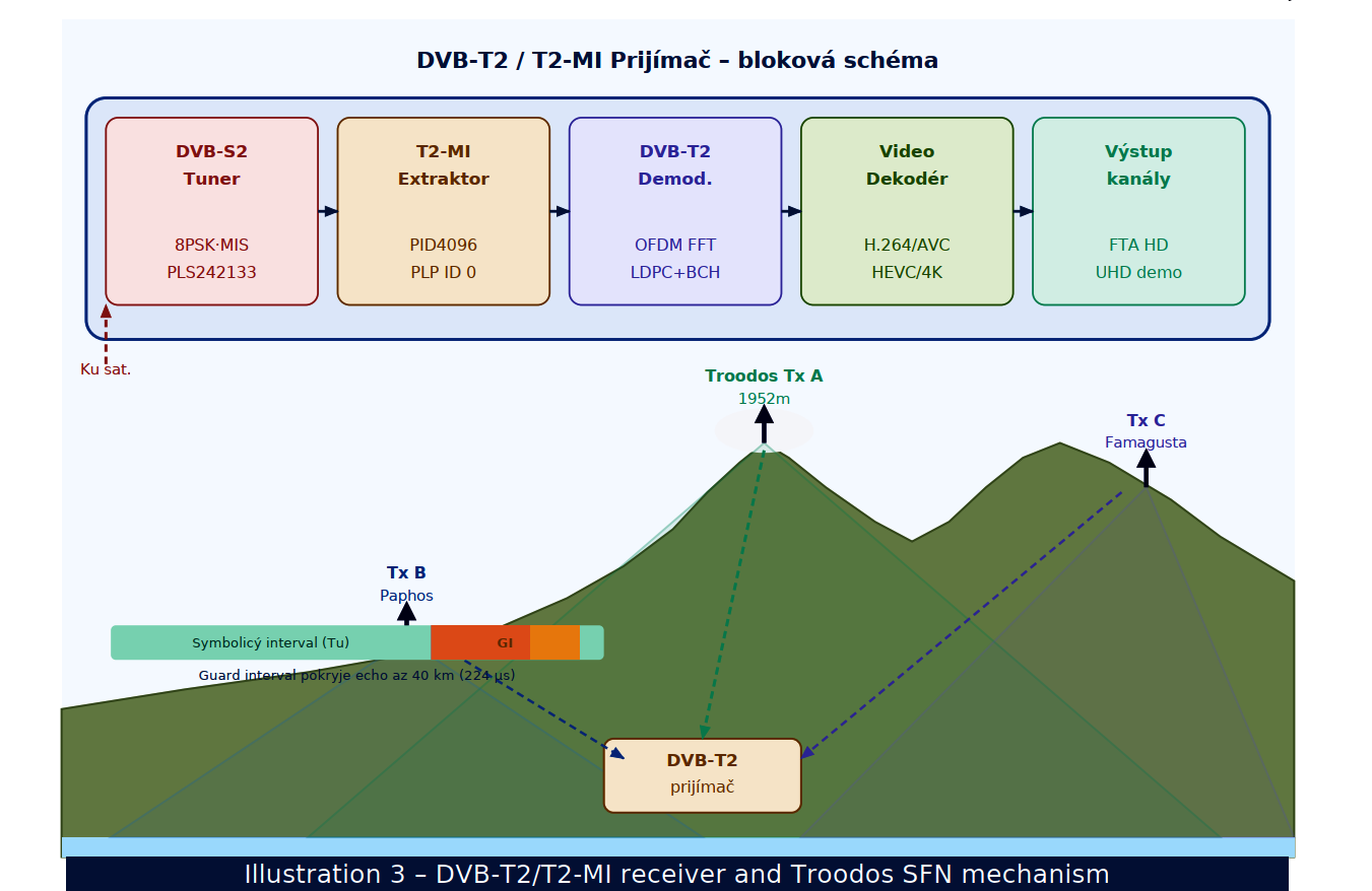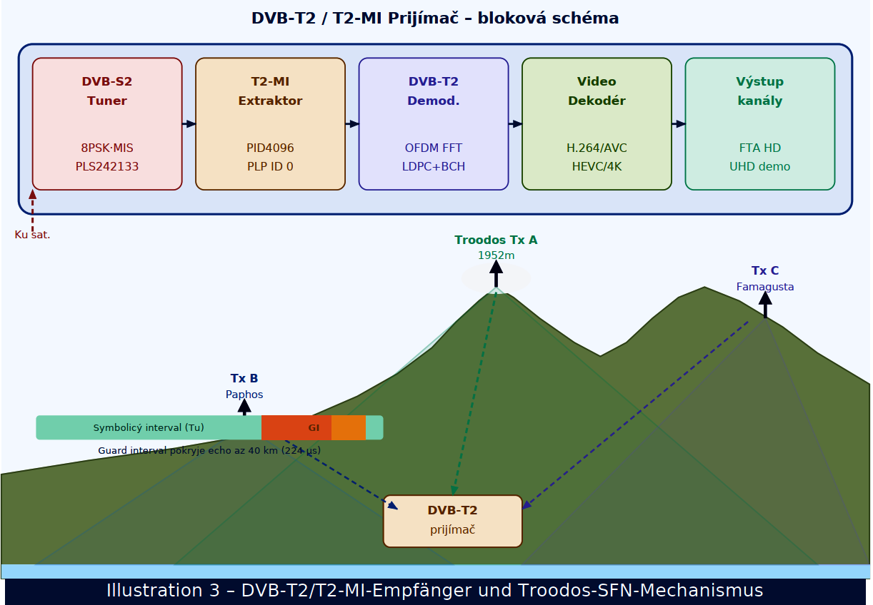 DVB-T2 demodulátor aplikuje OFDM demodulation (FFT 1K–32K), LDPC+BCH FEC dekódovanie a 256-QAM demoduláciu. Video dekodér spracúva H.264 AVC (HD kanály) a HEVC/H.265 (4K UHD demonštrácia). Výstupné kanály zahŕňajú Alpha TV, Antenna Cyprus, Sigma TV, Capital TV, One Channel, Plus TV, Vergina TV a Hellas Sat TV. Dolná časť – Troodos SFN mechanizmus: Ilustrácia zobrazuje horský profil Cypru s vrcholom Troodos (1952 m n.m.) v strede. Vysielač Tx A na vrchole Troodos má najväčšiu pokrytú oblasť vďaka svojej nadmorskej výške. Vysielač Tx B(oblasť Paphos) pokrýva západné tienisté oblasti, vysielač Tx C (Famagusta) pokrýva východné časti. Kľúčovým prvkom SFN funkcionality je ochranný interval (Guard Interval, GI). Pruhový diagram v dolnej časti zobrazuje časovú štruktúru OFDM symbolu: modrá časť predstavujeužitočný symbol (Tu), oranžová časť je Guard Interval. DVB-T2 štandard s FFT 32K a GI=1/4 poskytuje ochranný interval asi 224 µs, čo zodpovedá pokrytiu vzdialenosti až 67km. Keďže vzdialenosť medzi Troodos a pobrežím je 35–40 km, všetky echá zo susedných vysielačov dopadajú v rámci tohto okna a prijímač ich integruje konštruktívne. Výsledkom je vyšší SNR v tienistých oblastiach bez akejkoľvek špeciálnej úpravy prijímača. Satelitná distribúcia T2-MI zabezpečuje, že všetky vysielače v SFN sieti vysielajú identický T2-rámec v rovnakom čase – podmienka SFN synchronizácie je splnená TTO časovými značkami v T2-MI pakete. Požiadavky na príjem: DVB-S2 tuner s MIS · Gold PLS 242 133 · T2-MI dekodér · DVB-T2 (T2-Base) · H.264/AVC · odporúčané HEVC/H.265 pre 4K
