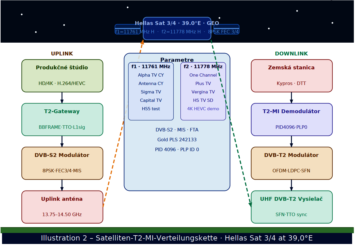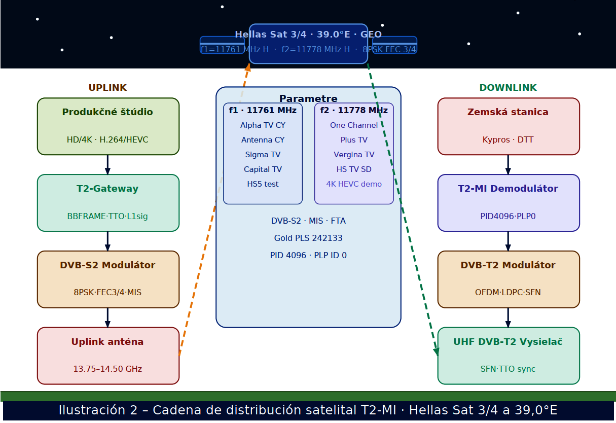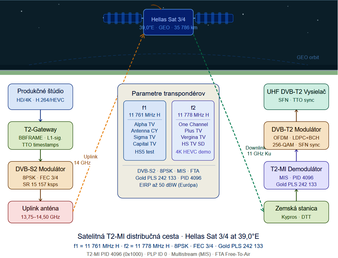 Ilustrácia komplexne zobrazuje celý distribučný reťazec cyperského DVB-T2 DTT systému od produkčného štúdia až po domáceho diváka, pričom stred cesty tvorí satelit Hellas Sat 3/4 na 39,0° v.d. Ľavá strana obrázku (UPLINK) zachytáva pozemskú časť cesty signálu smerom k satelitu. V produkčnom štúdiu sa vytvára programový obsah vo formátoch H.264 (HD) a HEVC (4K UHD). T2-Gateway konvertuje vstupné transportné toky na BBFRAME štruktúry, generuje L1-signalizáciu a vkladá TTO časové značky pre SFN synchronizáciu. DVB-S2 modulátor enkapsuluje T2-MI prúd do DVB-S2 nosnej s moduláciou 8PSK, FEC 3/4 a Multistream konfiguráciou (Gold PLS kód 242 133). Uplink anténa vysiela signál v pásme 13,75–14,50 GHz. Centrálny panel zobrazuje technické parametre oboch transpondérov. Transpondér f1 (11 761 MHz H) nesie kanály Alpha TV Cyprus, Antenna Cyprus, Sigma TV, Capital TV a HS5 (testovací kanál) v HD rozlíšení s kodekom H.264 AVC. Transpondér f2 (11 778 MHz H) nesie One Channel, Plus TV, Vergina TV, Hellas Sat TV (SD) a demonštračný 4K UHD kanál s kodekom HEVC/H.265. Pravá strana obrázku (DOWNLINK) znázorňuje príjem a spracovanie signálu na pozemskej strane Cypru. Zemská stanica prijíma downlink v pásme Ku (10,70–12,75 GHz). T2-MI demodulátor extrahuje T2-MI prúd z PID 4096 pomocou správne nakonfigurovaného Gold PLS kódu. DVB-T2 modulátor aplikuje OFDM moduláciu, LDPC+BCH FEC kódovanie a generuje UHF RF signál. UHF DVB-T2 vysielač distribuuje signál do SFN siete s TTO synchronizáciou.T2-MI/PLP Satelitné Vysielanie · Hellas Sat 3/4 · 39,0°E · dxsatcs.com Strana 4
