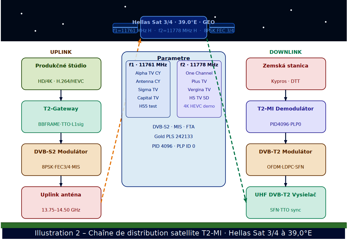 Le côté gauche (UPLINK) représente la partie terrestre du chemin du signal vers le satellite. Dans le studio de production, le contenu des programmes est créé aux formats H.264 (HD) et HEVC (4K UHD). Le T2-Gateway convertit les flux de transport d'entrée en structures BBFRAME, génère la signalisation L1 et insère des horodatages TTO pour la synchro-nisation SFN. Le modulateur DVB-S2 encapsule le flux T2-MI dans un porteur DVB-S2 avec modulation 8PSK, FEC 3/4 et configuration Multistream (code Gold PLS 242 133). L'antenne de montée de faisceau émet dans la bande 13,75–14,50 GHz. Le panneau central montre les paramètres techniques des deux transpondeurs. Le transpondeur f1 (11 761 MHz H) porte Alpha TV Cyprus, Antenna Cyprus, Sigma TV, Capital TV et HS5 (chaîne de test) en résolution HD avec le codec H.264 AVC. Le transpondeur f2 (11 778 MHz H) porte One Channel, Plus TV, Vergina TV, Hellas Sat TV (SD) et une chaîne de démonstration 4K UHD avec le codec HEVC/H.265. Le côté droit (DOWNLINK) montre la réception et le traitement du signal du côté chypriote. La station terrestre reçoit la liaison descendante en bande Ku (10,70–12,75 GHz). Le démo-dulateur T2-MI extrait le flux T2-MI du PID 4096 en utilisant le code Gold PLS correctement configuré. Le modulateur DVB-T2 applique la modulation OFDM, le codage FEC LDPC+BCH et génère un signal RF UHF. L'émetteur UHF DVB-T2 distribue le