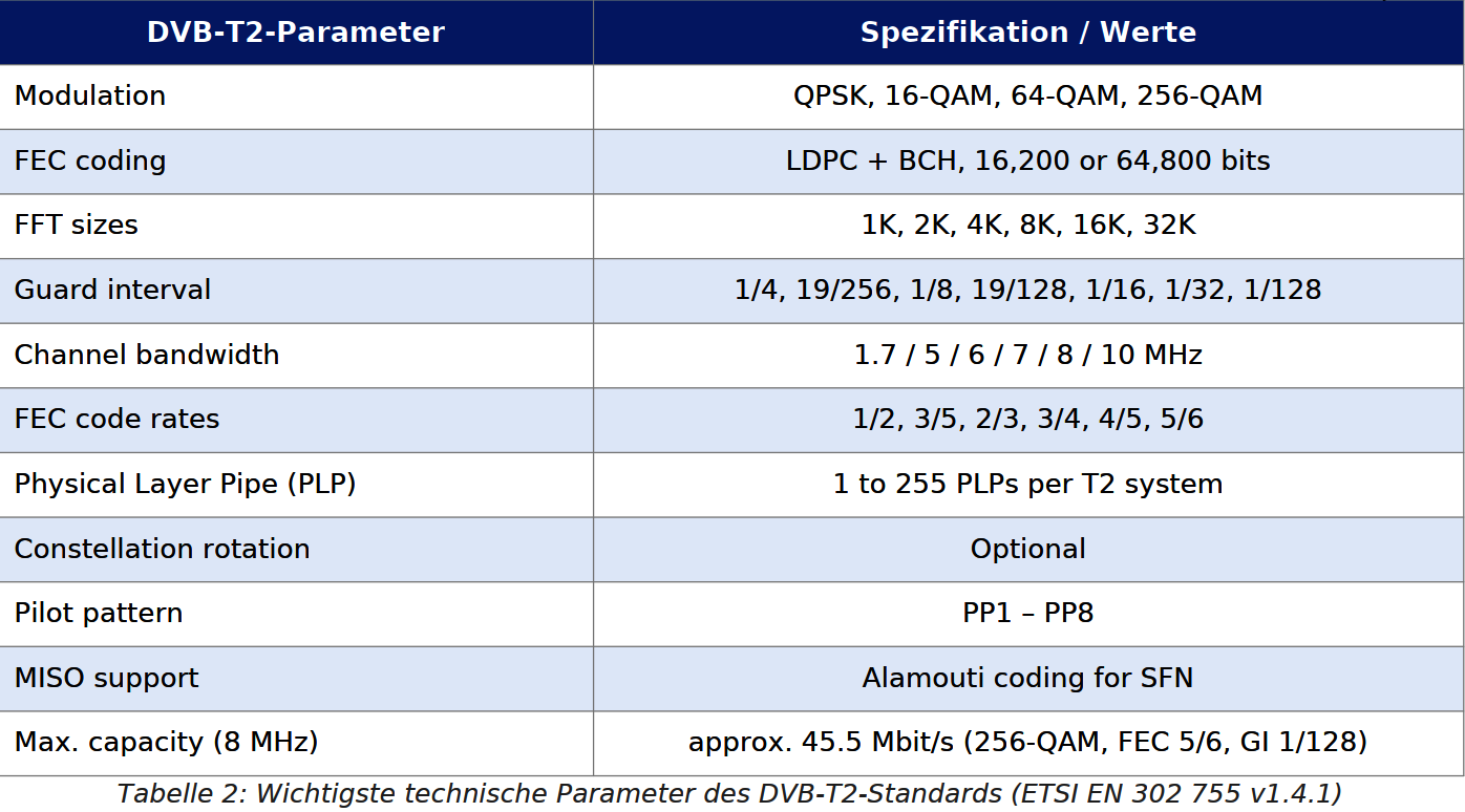 [1] ETSI EN 302 755 V1.4.1 (2015): DVB; Frame structure, channel coding and modulation for DVB-T2. ETSI, Sophia