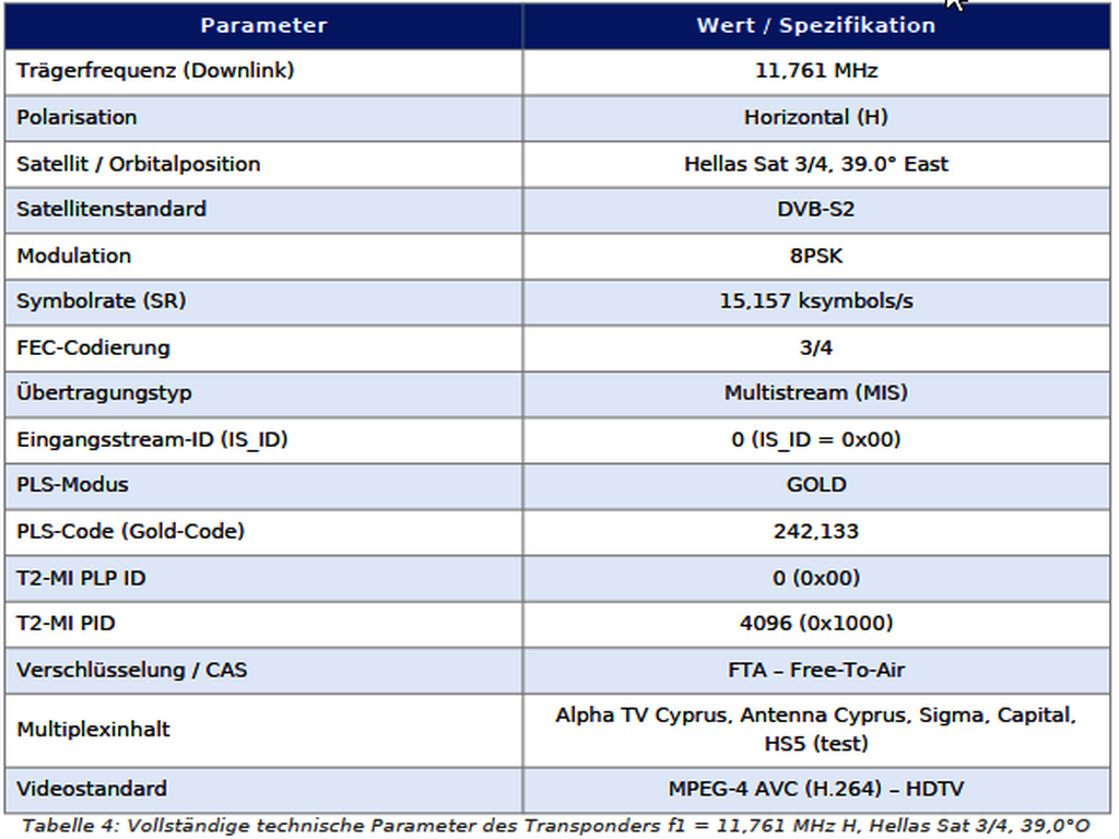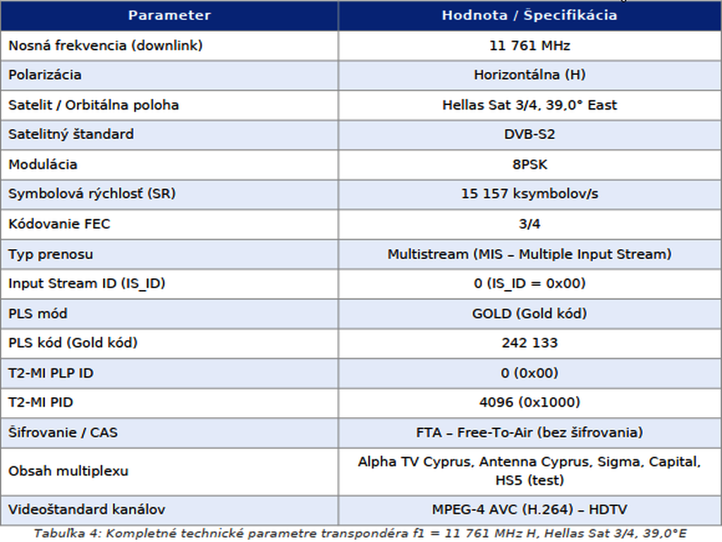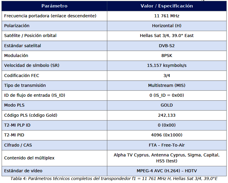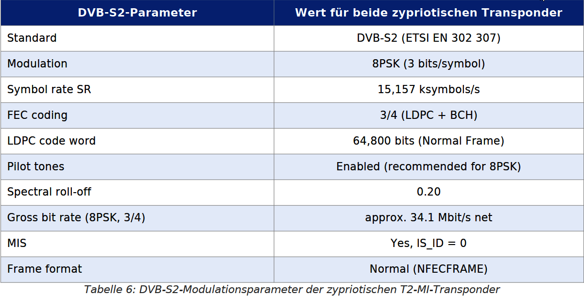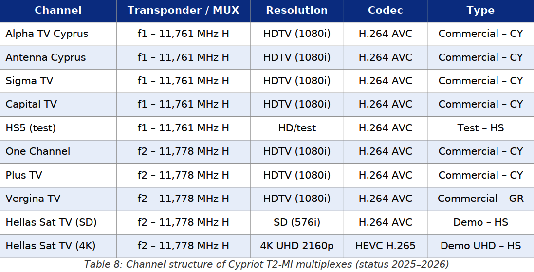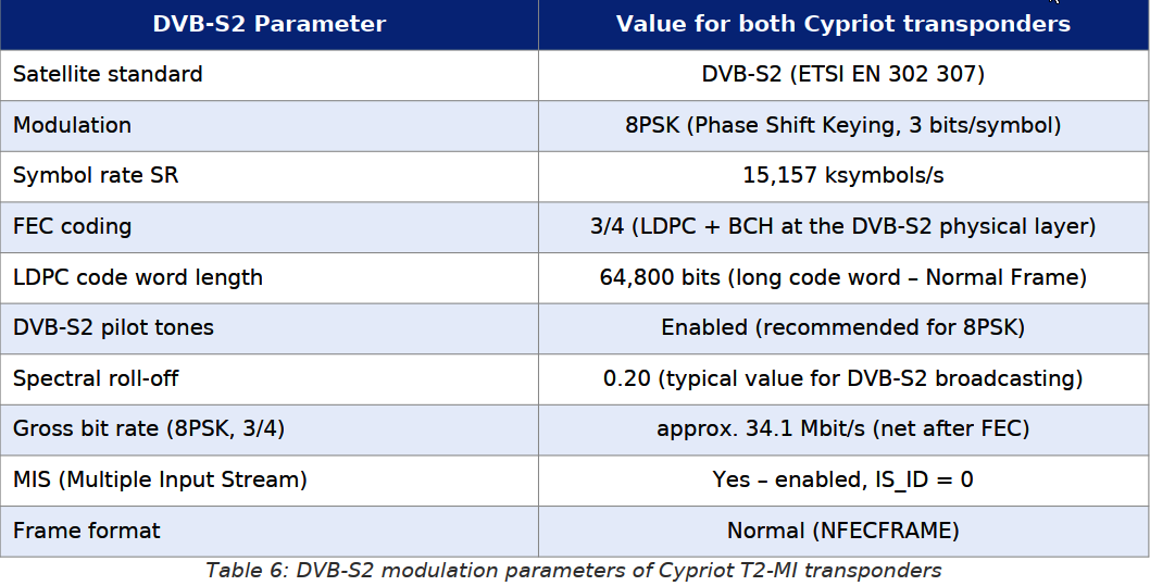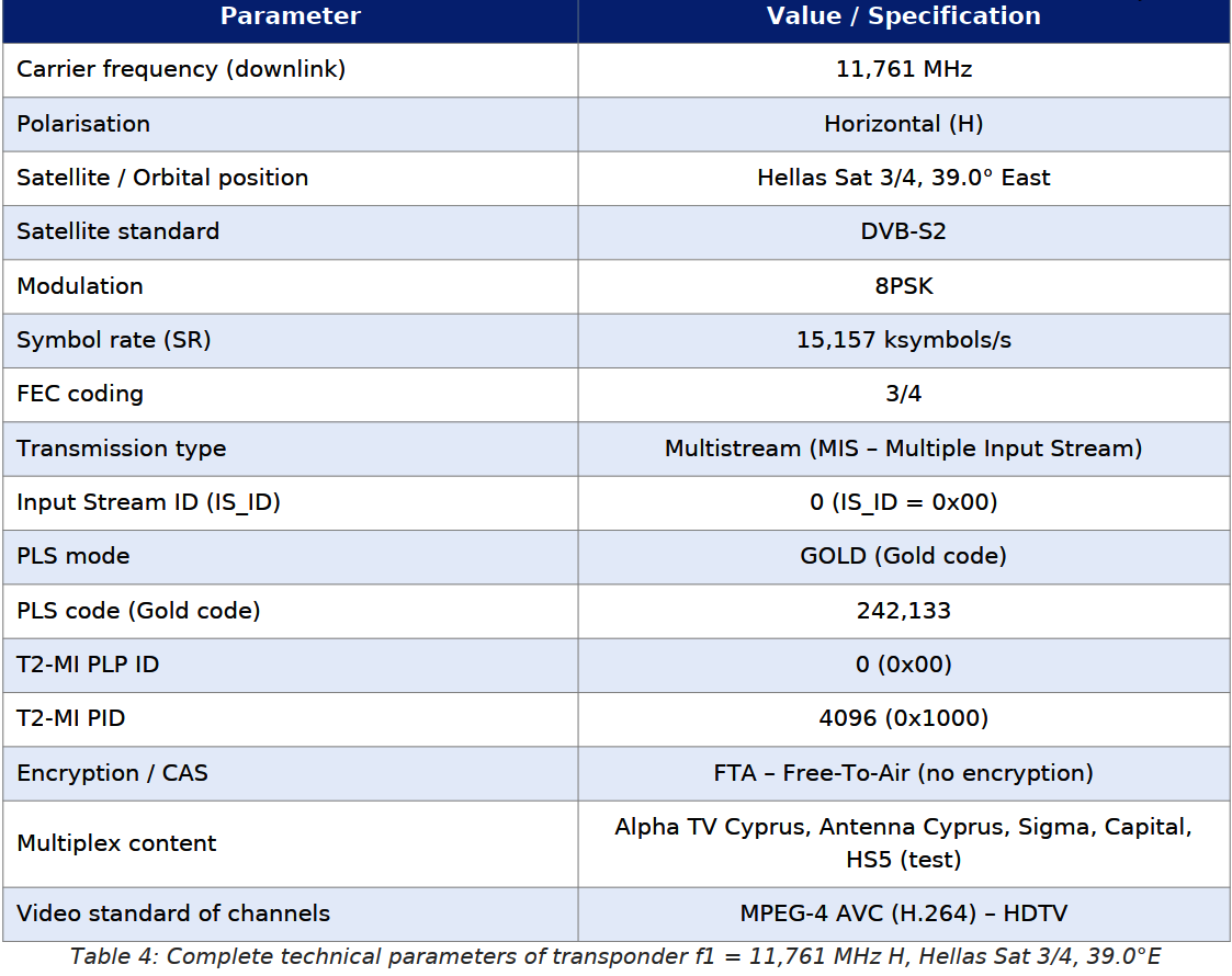 Prvý cyperský T2-MI transpondér pracuje na frekvencii f1 = 11 761 MHz, polarizácia horizontálna (H). Nasledujúca tabuľka uvádza kompletné technické parametre transpondéra: