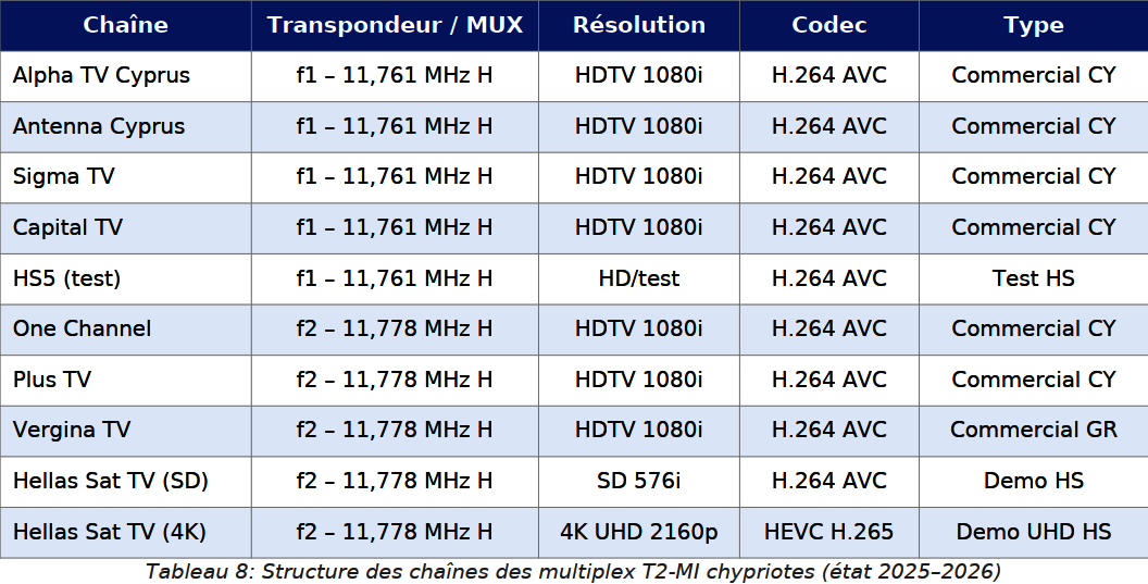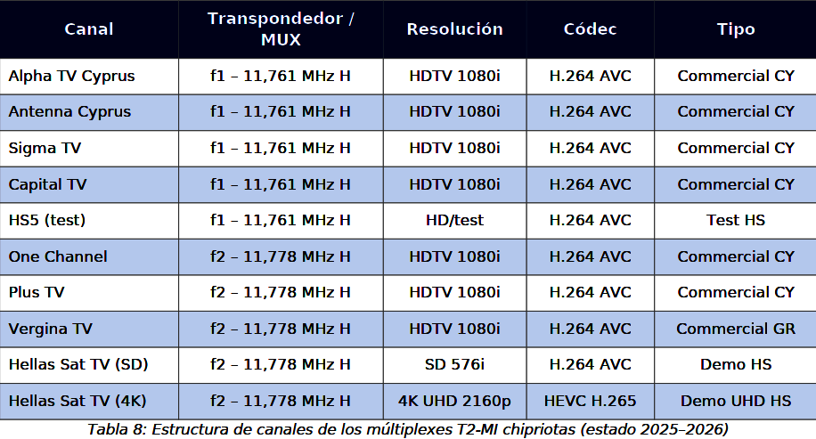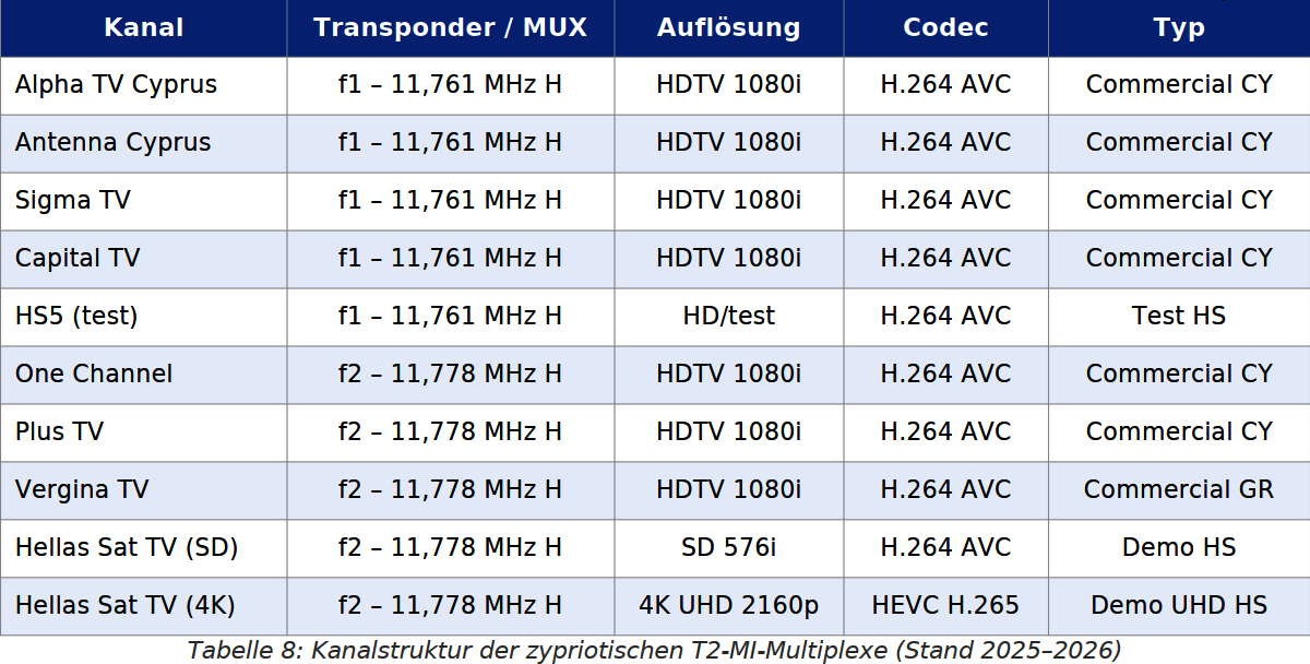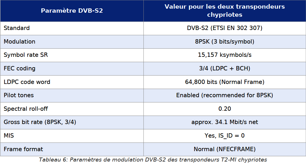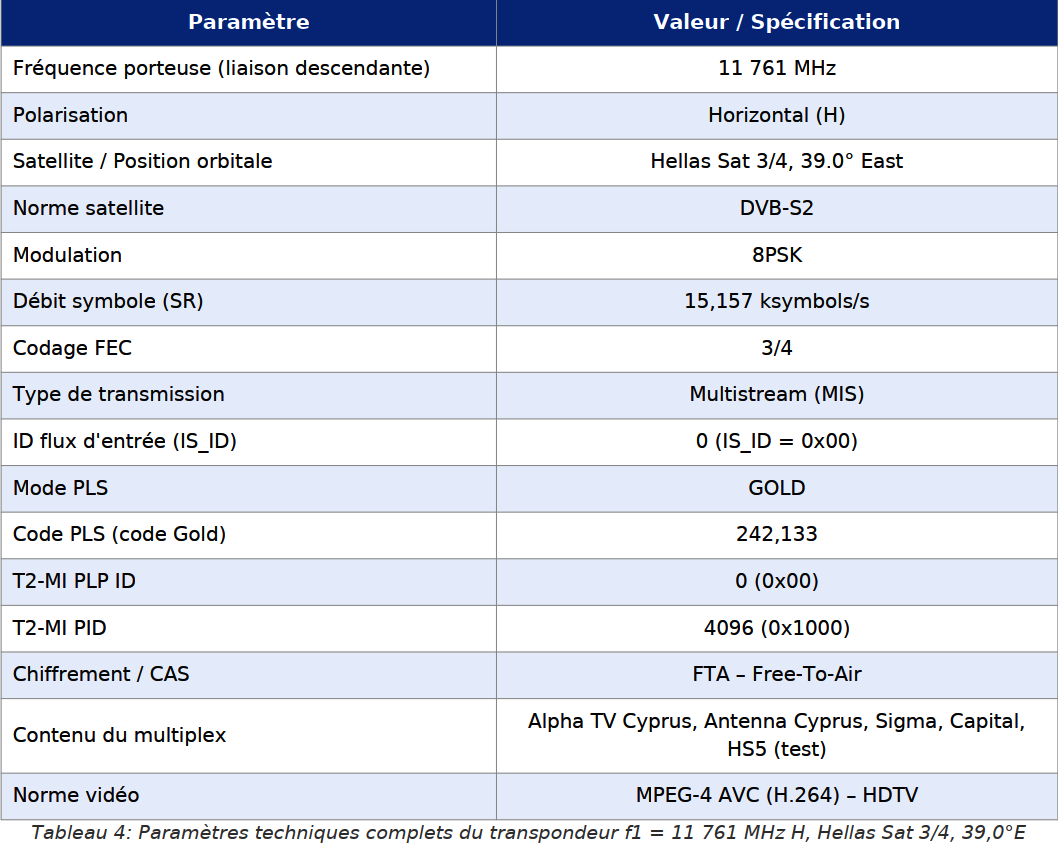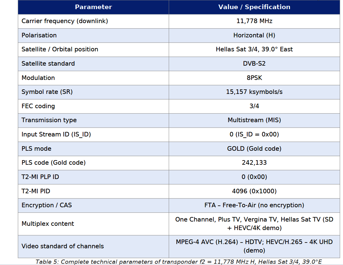 Prvý cyperský T2-MI transpondér pracuje na frekvencii f1 = 11 761 MHz, polarizácia horizontálna (H). Nasledujúca tabuľka uvádza kompletné technické parametre transpondéra: