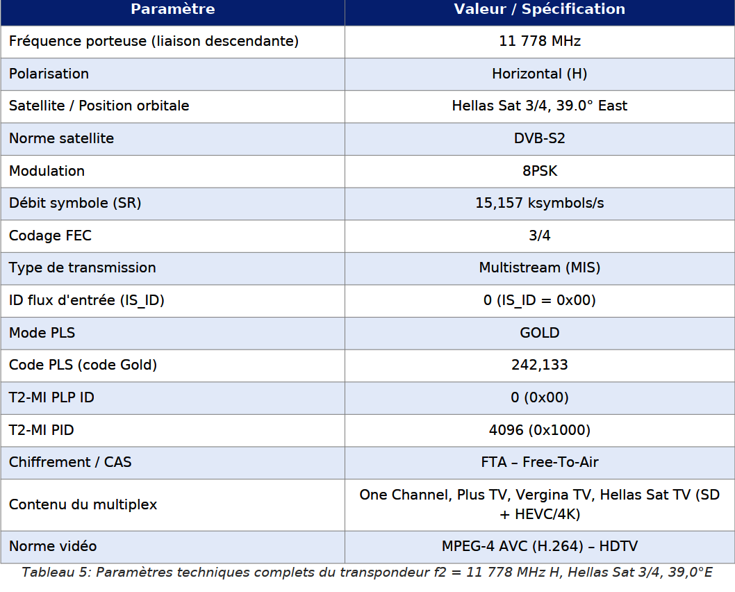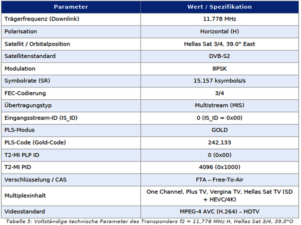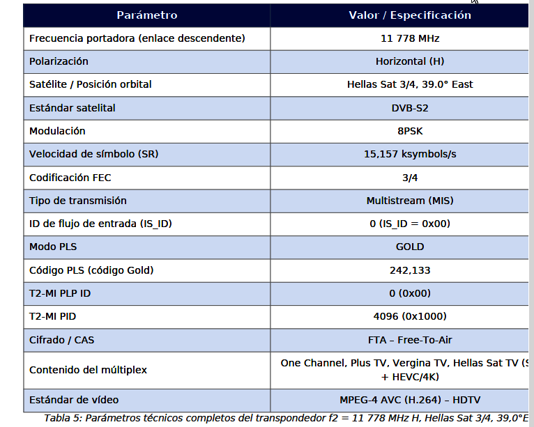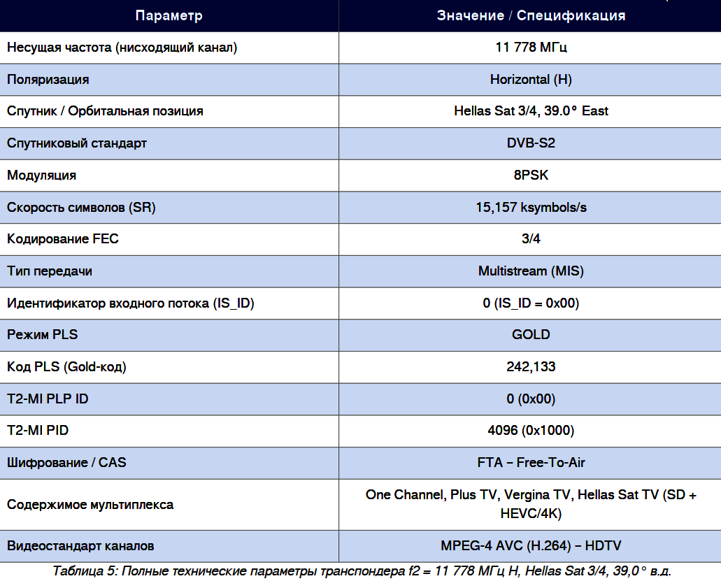 Второй кипрский транспондер T2-MI работает на частоте f2 = 11 778 МГц, горизонтальная поляризация (H). В следующей таблице приведены полные технические параметры: