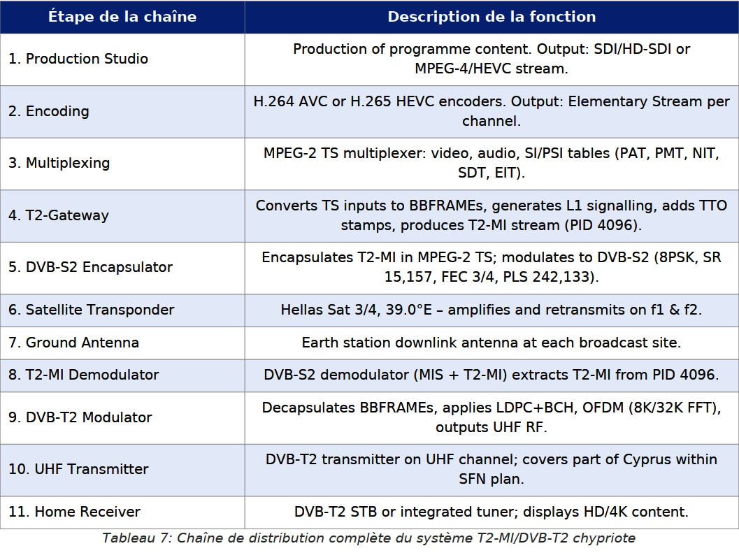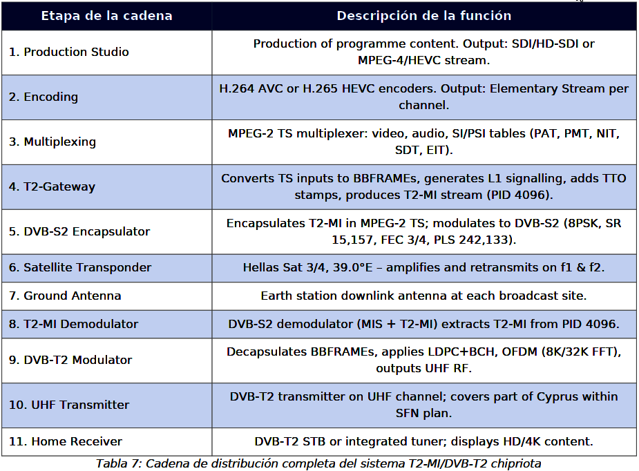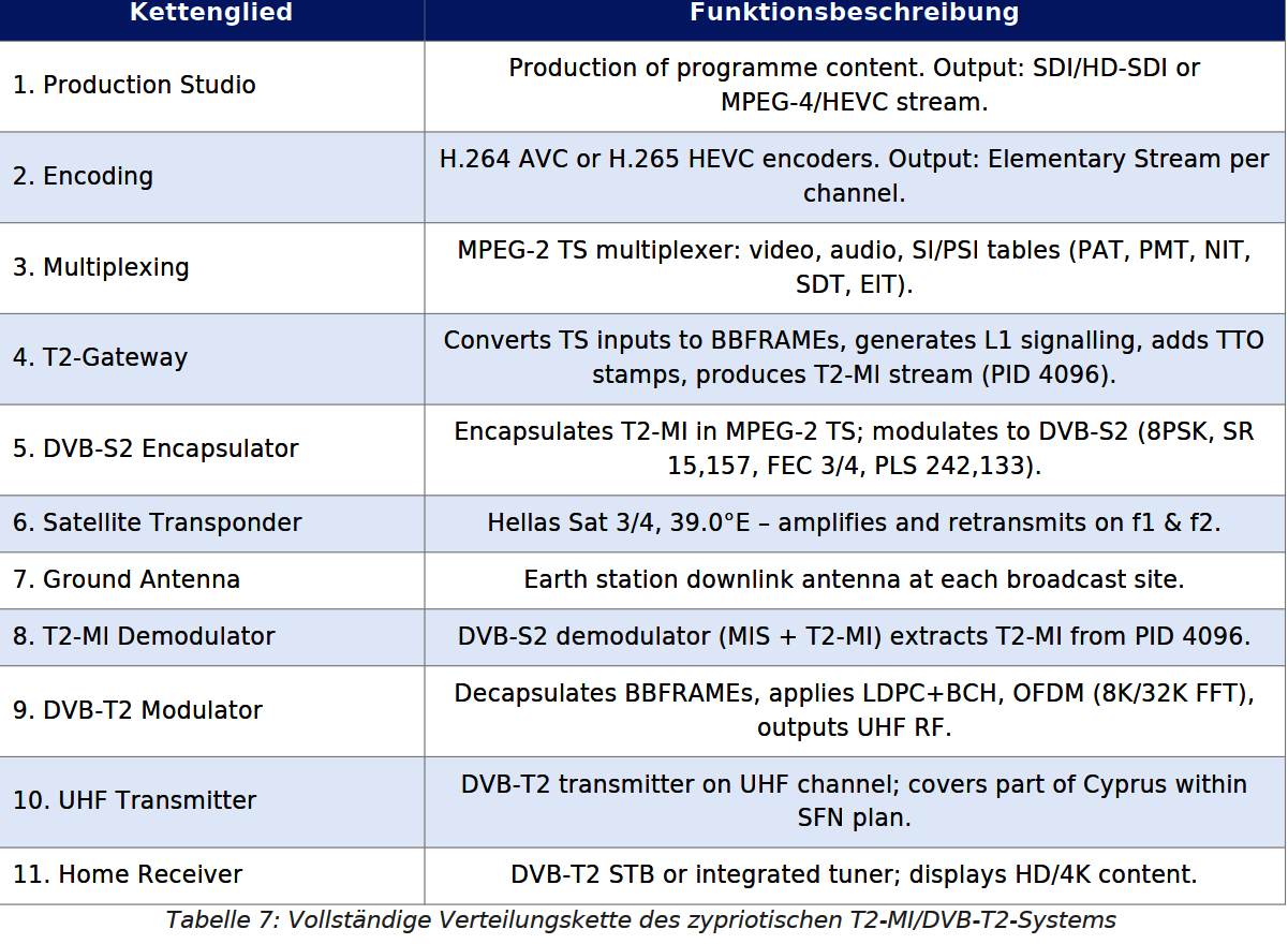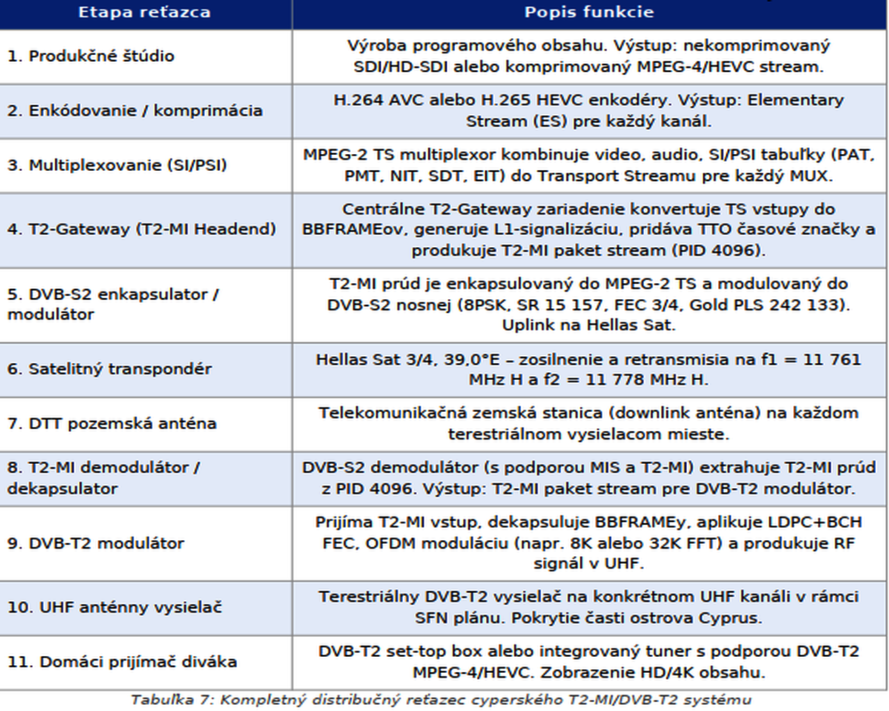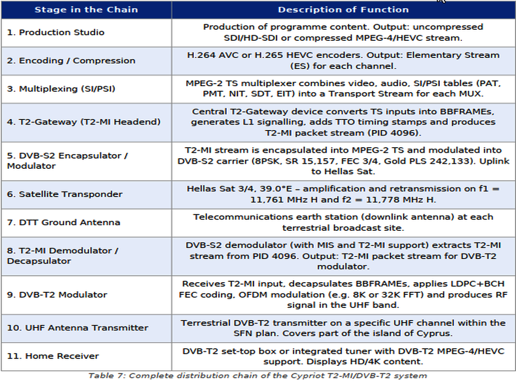 Kompletný distribučný reťazec cyperského T2-MI/DVB-T2 systému pozostáva z niekoľkých technologicky odlišných, ale funkčne prepojených vrstiev:viď. tabuľka