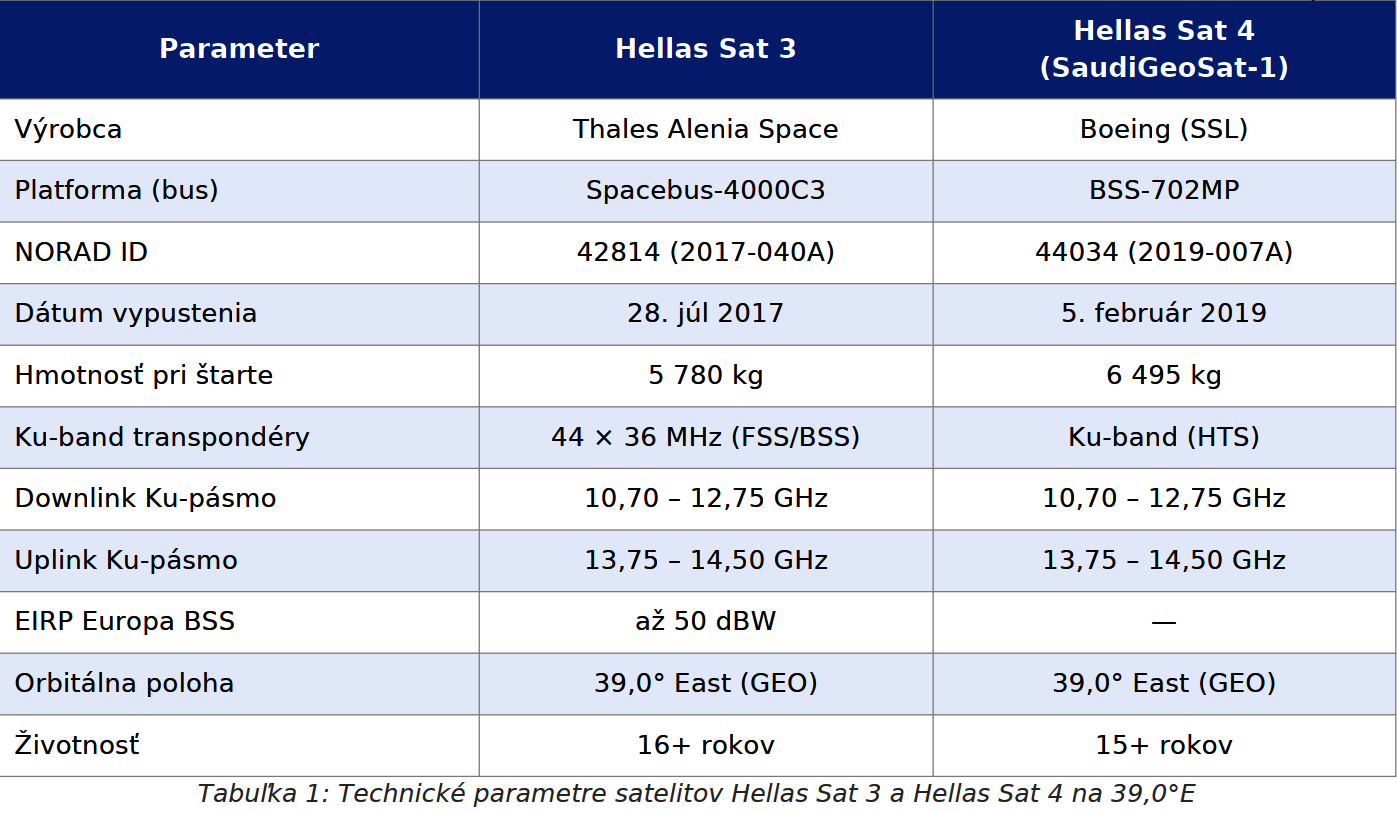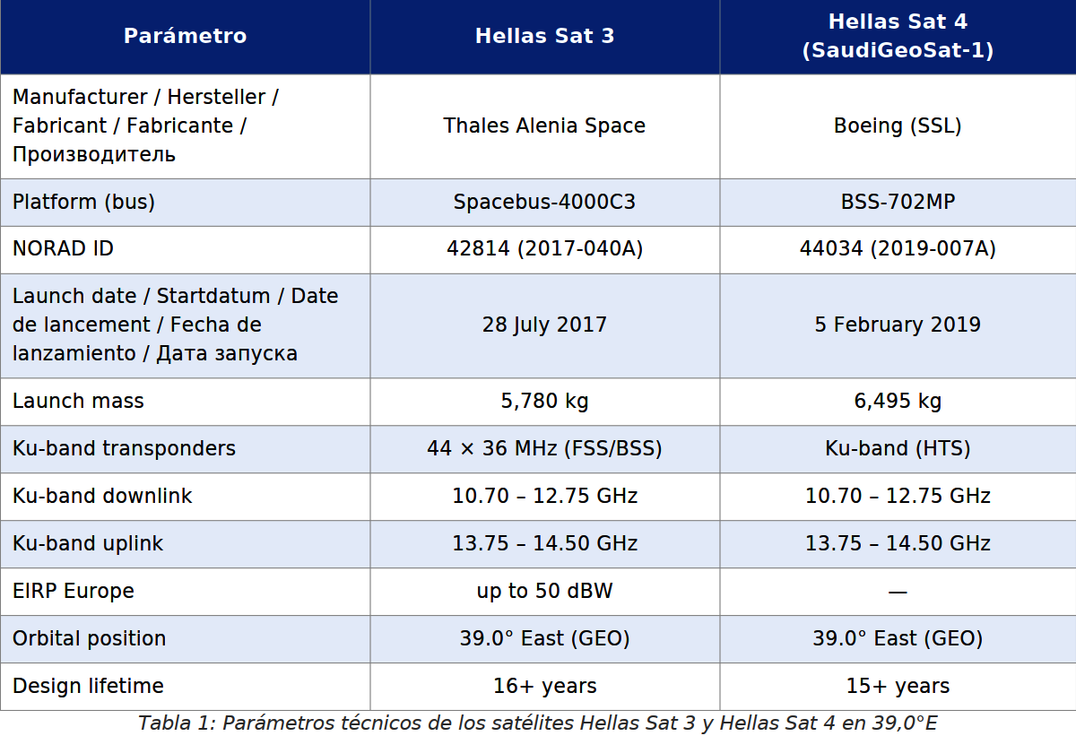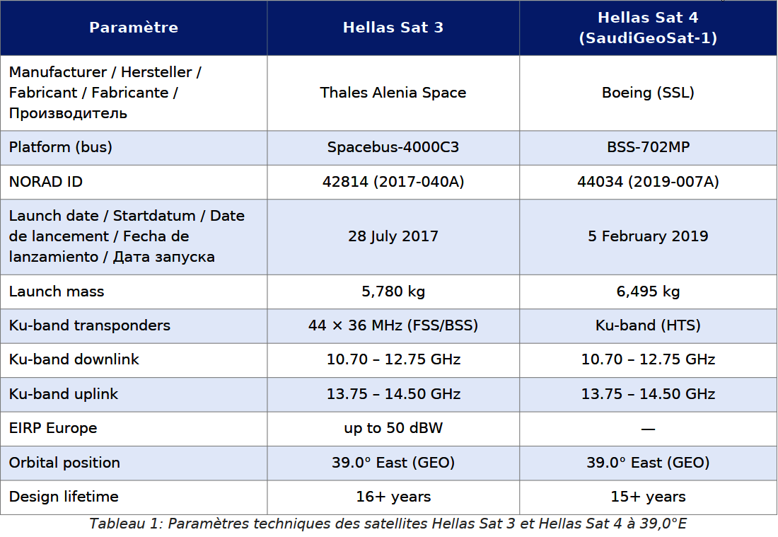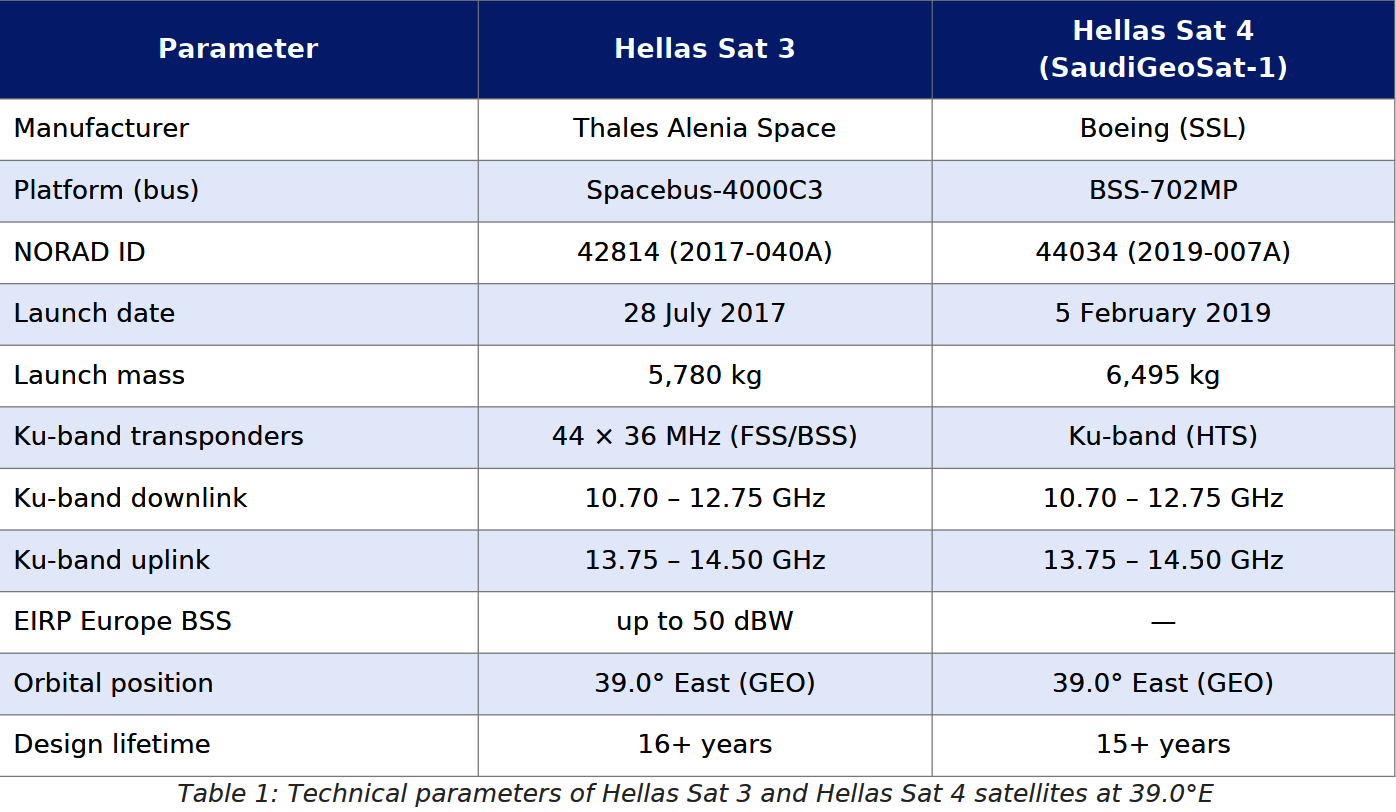 Na orbitálnej polohe 39,0° East sú ko-lokované dva satelity: Hellas Sat 3 a Hellas Sat 4 (SaudiGeoSat-1). Hellas Sat 3 bol vypustený 28. júla 2017 raketou Ariane 5 ECA z Guiany. Hellas Sat 4 bol vypustený 5. februára 2019, taktiež raketou Ariane 5 ECA. Obidva satelity spoločne pokrývajú regióny Európy, Blízkeho východu a subsaharskej Afriky. Európsky Ku-band lúč Hellas Sat 3 (FSS/BSS beam) dosahuje hodnoty EIRP až 50 dBW nad územím Grécka, Cypru a Balkánskeho polostrova. Táto vysoká úroveň EIRP umožňuje príjem aj s anténami priemeru 70–80 cm v strednej Európe a s anténami