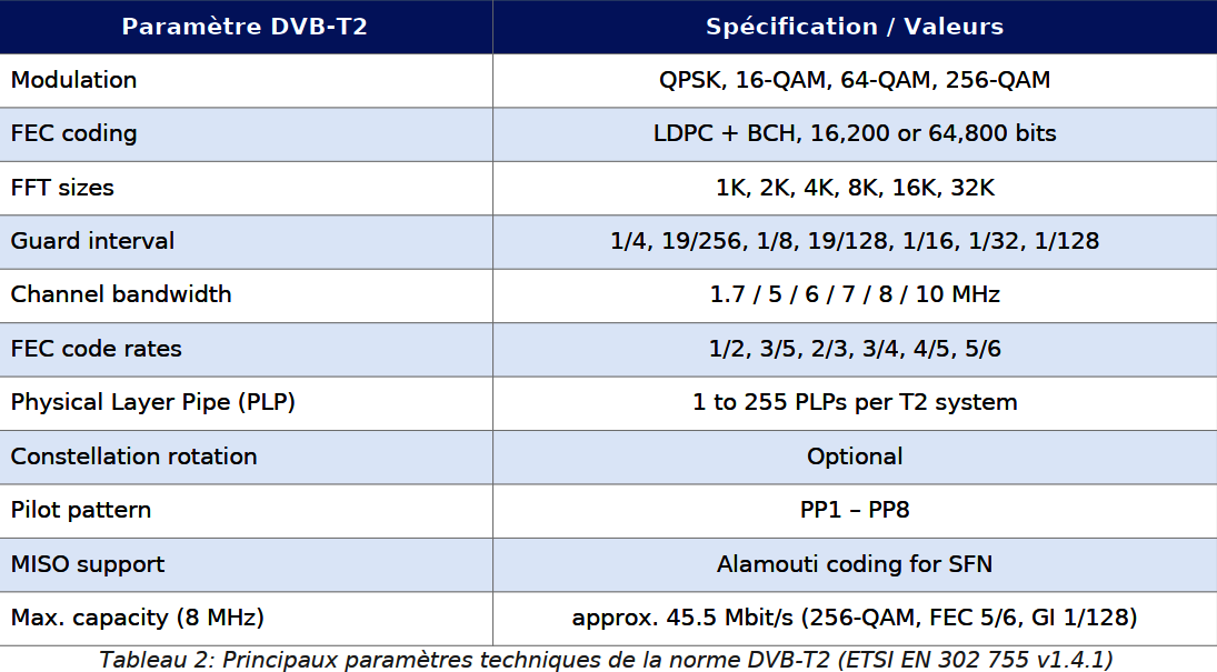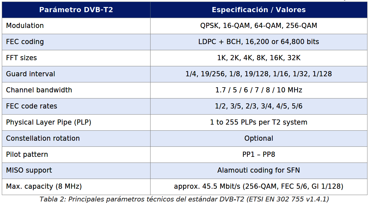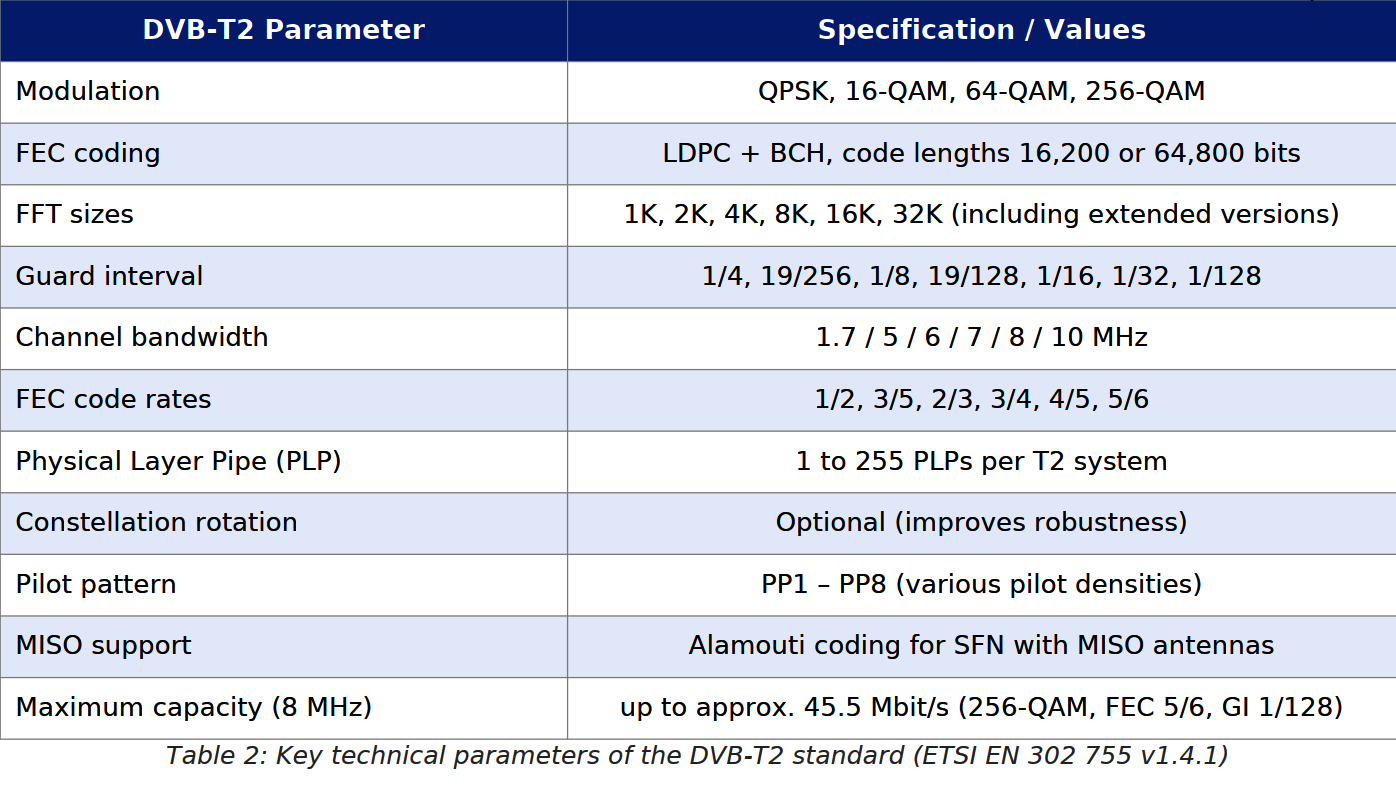 DVB-T2 определён нормой ETSI EN 302 755 и представляет второе поколение европейского стандарта цифрового эфирного телевидения. По сравнению с DVB-T он обеспечивает прирост спектральной ёмкости на 30–50 % благодаря: передовому кодированию LDPC+BCH, модуляции 256-QAM, физическим уровневым каналам (PLP), расширенным размерам БПФ (1K–32K), более длинным защитным интервалам и полной поддержке SFN-сетей.