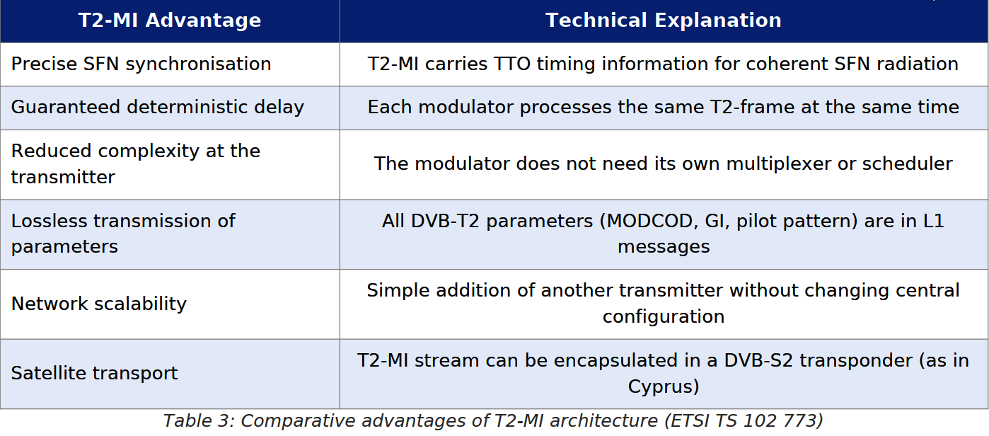 prijímací bod. Cyperský DTT systém je navrhnutý ako štyri SFN siete s celkovo ôsmimi prenosovými kanálmi: každá SFN pokrýva inú oblasť ostrova (Troodos, Famagusta a ďalšie). T2-MI distribúcia cez satelit zaručuje, že všetky DVB-T2 modulátory v danej SFN sieti dostávajú identické T2-MI pakety s rovnakými TTO hodnotami, čím je SFN synchronizácia zaistená bez potreby GPS prijímačov alebo dedikovaných IP-synchronizačných protokolov.