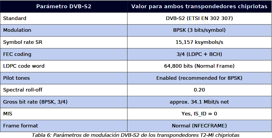 DVB-S2 štandard (ETSI EN 302 307) definuje dva módy vstupného toku: SIS (Single Input Stream) a MIS (Multiple Input Stream). Cyperský T2-MI link využíva MIS mód, ktorý umožňuje prenos viacerých logicky nezávislých vstupných tokov na jednom nosnom signáli. Každý vstupný tok je identifikovaný 8-bitovým Input Stream Identifier (ISI / IS_ID). N oboch cyperských frekvenciách je IS_ID = 0, čo znamená jediný aktívny vstupný tok.