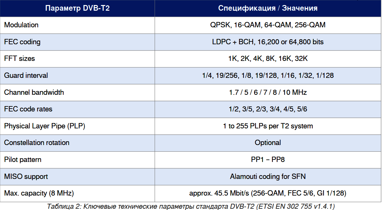 4.1 Ключевые технические характеристики DVB-T2