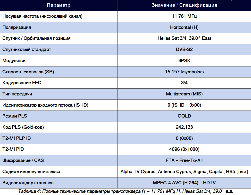 Первый кипрский транспондер T2-MI работает на частоте f1 = 11 761 МГц, горизонтальная поляризация (H). В следующей таблице приведены полные технические параметры: