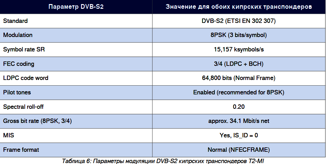 Стандарт DVB-S2 (ETSI EN 302 307) определяет два режима входного потока: SIS (Single Input Stream) и MIS (Multiple Input Stream). Кипрский канал T2-MI использует режим MIS. На обеих кипрских частотах IS_ID = 0.