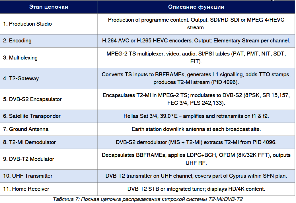 Полная цепочка распределения кипрской системы T2-MI/DVB-T2 состоит из нескольких технологически различных, но функционально взаимосвязанных уровней: