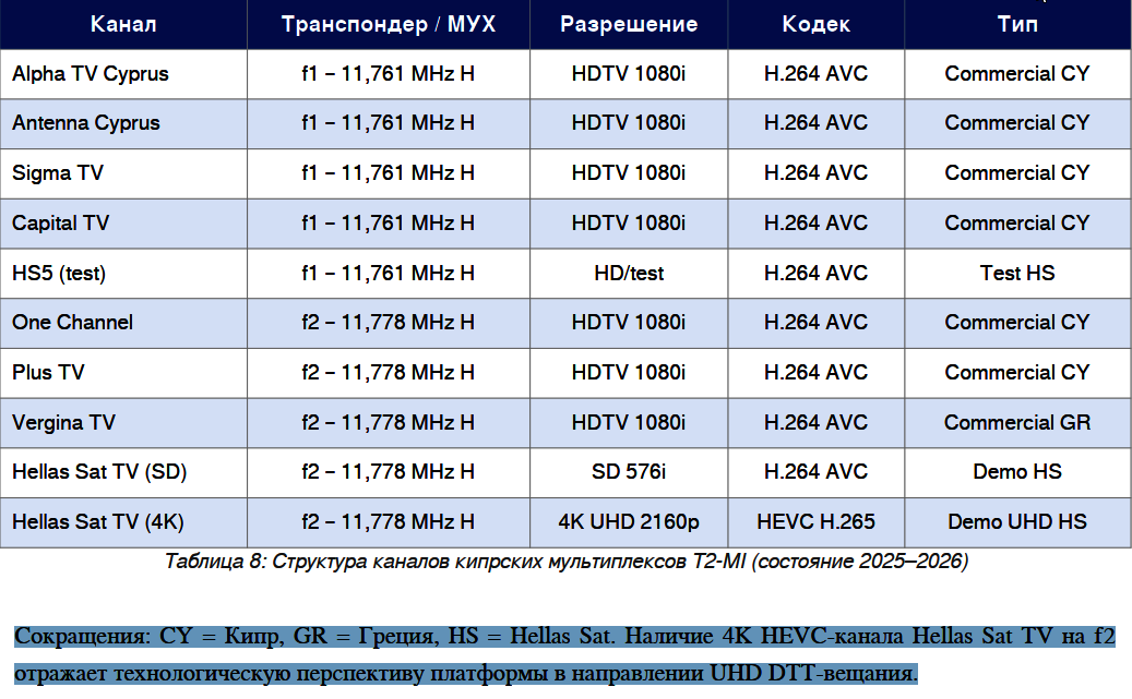 Сокращения: CY = Кипр, GR = Греция, HS = Hellas Sat. Наличие 4K HEVC-канала Hellas Sat TV на f2 отражает технологическую перспективу платформы в направлении UHD DTT-вещания.