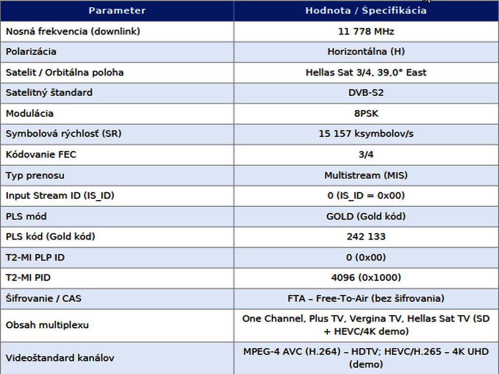 Technická poznámka k f1: Niektoré zdroje uvádzali pre f1 = 11 761 MHz pôvodný Root kód 211 867 a novší Gold kód 242 133 – ide o historický vývoj nastavenia transpondéra. Aktuálne (2025–2026) oba transpondéry f1 aj f2 používajú konzistentne Gold kód 242 133.