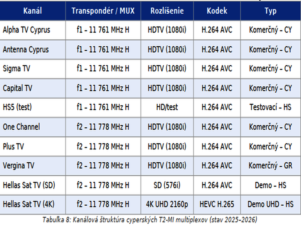 8. Satelitné T2-MI vysielanie na Cypre: Parametre frekvencie f2 = 11 778 MHz H