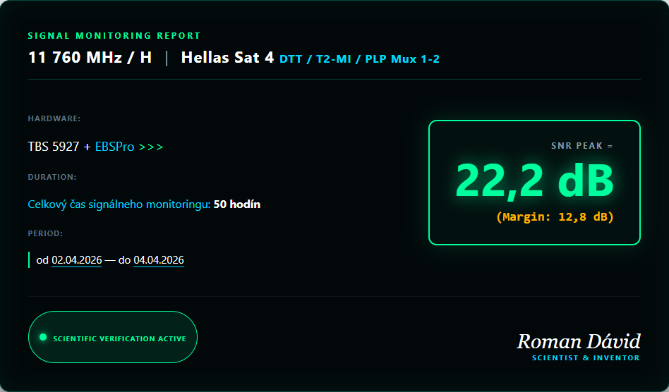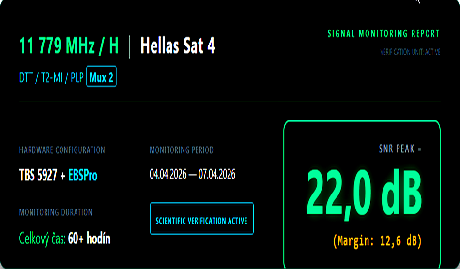 SK_Výsledok prvého oficiálneho signálneho monitoringu na T2-MI nosnej frekvencii f = 11 779 MHz_H dokazuje nasledovný stav: dvojsekundové výpadky v locku, po ktorých okamžite nasleduje spojitý (kontinuálny) priebeh bez trvalého výpadku nosnej, a približne 20 sekúnd príjmu s mikro-pixeláciou obrazu počas monitorovacej jednotky t = 60+ hodín verifikujú percentuálnu stabilitu príjmu na úrovni 99,9 %, a to aj napriek výskytu silného nárazového vetra s rýchlosťou 8 – 14 m/s dňa 6. 4. 2026 v mojej zemepisnej oblasti podľa výsledkov meraní SHMÚ.